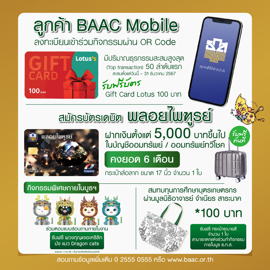 พิเศษ! เมื่อฝากสลากออมทรัพย์ทวีสิน ชุดมรกต สลากออมทรัพย์ ธ.ก.ส. ชุดถุงเงิน ชุดขวัญถุง และสลากดิจิทัล ธ.ก.ส. ตั้งแต่ 2,000 บาทขึ้นไป แต่ไม่เกิน 100,000 บาท รับฟรีกระปุก A-Pigeon หรือฝาก 100,000 – 500,000 บาท รับฟรี กระปุก คุณ ME กึ๋น และฝากเกิน 500,000 บาทขึ้นไป รับฟรีอาร์ตทอยมังแมวสุดน่ารัก 4 ตัว นอกจากนี้เมื่อฝากเงินบัญชีออมทรัพย์หรือออมทรัพย์ทวีโชค ตั้งแต่ 58,000 บาทขึ้นไป และคงยอดเงินไว้ 3 เดือน หรือเปิดบัญชี A-Savings คู่กับบัตรอิเล็กทรอนิกส์บนแอปพลิเคชัน BAAC Mobile ลุ้นรับสิทธิ์จุ่ม มังแมว 1 ตัว หรือเมื่อสะสมยอดการทำธุรกรรมบนแอปพลิเคชัน BAAC Mobile สะสมสูงสุด 50 ลำดับแรก ตั้งแต่วันนี้จนถึง 31 ธันวาคม 2567 รับฟรี! บัตรของขวัญโลตัส มูลค่า 100 บาท (เงื่อนไขเป็นไปตามที่ธนาคารกำหนด)