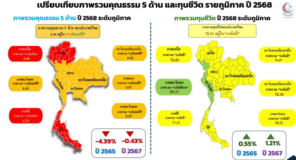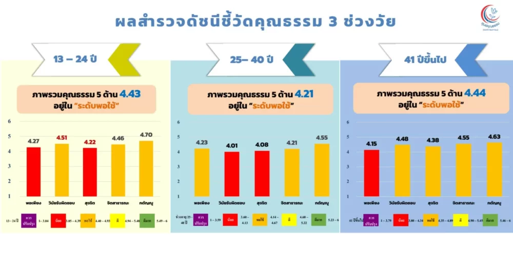 รศ.นพ.สุริยเดว ทรีปาตี ผู้อำนวยการศูนย์คุณธรรม เปิดเผยผลสำรวจว่า “ดัชนีชี้วัดคุณธรรมของคนไทยทั้ง 3 ช่วงวัย (13–24 ปี, 25–40 ปี และ 41 ปีขึ้นไป) อยู่ในระดับ “พอใช้” เฉลี่ย 4.3 คะแนน ขณะที่ดัชนีทุนชีวิตอยู่ในระดับ “ดี” โดยมีคะแนนเฉลี่ยเกือบ 79% โดยเฉพาะกลุ่มวัย 41 ปีขึ้นไปที่มี “พลังตัวตน” โดดเด่นที่สุด ส่วนในระดับภูมิภาค พบว่าภาคตะวันตกมีค่าเฉลี่ยสูงสุด อยู่ในระดับ “ดีมาก” ที่ร้อยละ 80.41 สะท้อนถึงศักยภาพทุนชีวิตที่แข็งแรงและเป็นรากฐานสำคัญในการกำหนดทิศทางสังคมไทยในอนาคต”