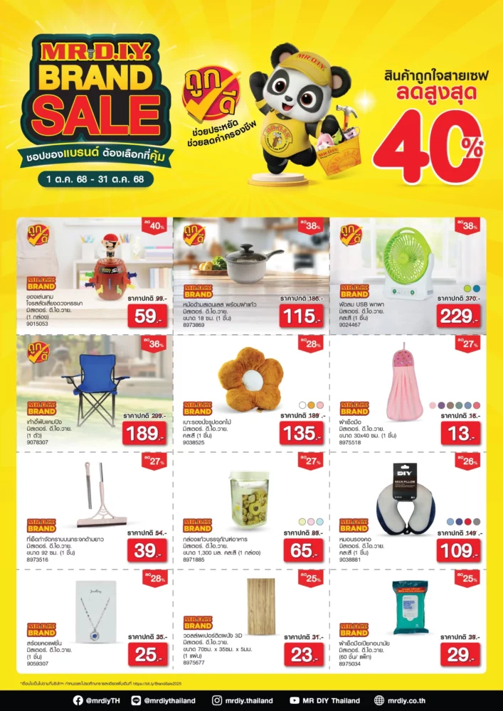 อย่าพลาดโอกาสประหยัดสุดคุ้มกับแคมเปญ “BRAND SALE ชอปของแบรนด์ ต้องเลือกที่คุ้ม” ได้ตั้งแต่วันที่ 1 ตุลาคม ถึง 31 ตุลาคม 2568 ณ ร้านมิสเตอร์. ดี.ไอ.วาย. ทุกสาขาทั่วประเทศ และช่องทางออนไลน์ตลอด 24 ชั่วโมงที่ WWW.MRDIY.CO.TH หรือ MR. D.I.Y. Online Store บน Shopee Mall, Laz Mall และ TikTok Shop