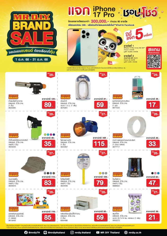 แคมเปญครั้งใหญ่แห่งปี “BRAND SALE ชอปของแบรนด์ ต้องเลือกที่คุ้ม” ยกขบวนสินค้าแบรนด์มิสเตอร์. ดี.ไอ.วาย. มาลดราคาสูงสุดถึง 40%* ใน 6 แผนกหลัก ครอบคลุมทั้งสินค้าเครื่องใช้ในครัวเรือน อุปกรณ์ฮาร์ดแวร์ เครื่องใช้ไฟฟ้า เครื่องเขียนและอุปกรณ์กีฬา ของเล่น และสินค้าไลฟ์สไตล์ ตอบโจทย์ผู้บริโภคสายเซฟที่มองหาความคุ้มค่า และช่วยลดภาระค่าครองชีพในช่วงปลายปี พร้อมกิจกรรม “ชอป แล้ว โชว์” ร่วมชิงสิทธิ์เป็นผู้ชนะรางวัล iPhone 17 Pro** และรางวัลอื่นๆ รวมมูลค่ากว่า 300,000 บาท ตั้งแต่วันที่ 1 กันยายน 2568 – 31 ตุลาคม 2568