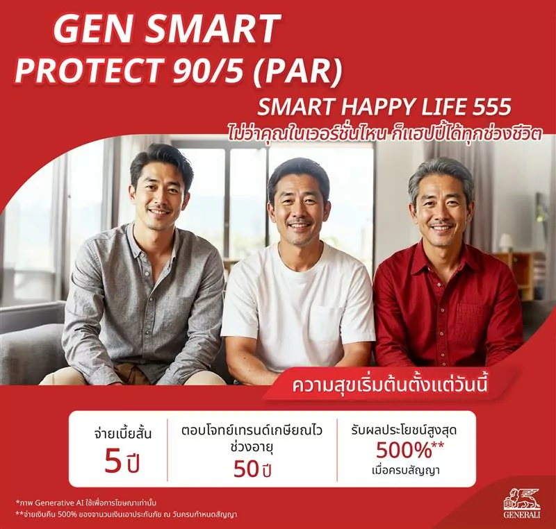 เจนเนอราลี่ ประกันชีวิต ไทยแลนด์ เดินหน้าลุยตลาดประกันชีวิตไตรมาสสุดท้ายปี 2025 เปิดตัวผลิตภัณฑ์ใหม่ “GEN SMART PROTECT 90/5 (PAR)” ประกันชีวิตสะสมทรัพย์แบบมีเงินปันผล โดดเด่นด้วยการชำระเบี้ยสั้น แต่ให้ความคุ้มครองยาวนาน ผลตอบแทนต่อเนื่อง ตอบโจทย์ผู้บริโภคยุคดิจิทัลที่ต้องการวางแผนทางการเงินเพื่อเตรียมพร้อมสร้างหลักประกันระยะยาว ใช้ชีวิตได้อย่างอิสระ มั่นใจ และมีแผนสำรองที่มั่นคงในอนาคต