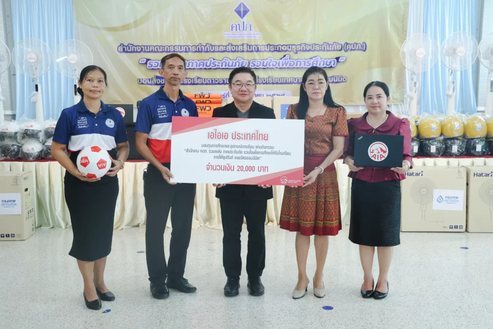 นอกจากนี้ นายสุวิรัช พงศ์เสาวภาคย์ (กลาง) ผู้อำนวยการฝ่ายกิจการภายนอก เป็นผู้แทนเอไอเอ ประเทศไทยมอบทุนการศึกษาจำนวน 20,000 บาท ลูกฟุตบอล 5 ลูก และแล็ปท็อป 10 เครื่อง โดยมีนายโชคอนันต์ นาคสงวน (ที่ 2 จากซ้าย) ผู้อำนวยการโรงเรียนเทศบาลวัดธรรมนิมิต และนางสาวณัฏฐ์วิภา สุริยันต์ (ที่ 2 จากขวา) รองผู้อำนวยการกลุ่มบริหารงานบุคคล โรงเรียนถาวรานุกูล เป็นผู้รับมอบ ผ่านกิจกรรม “สำนักงาน คปภ. รวมพลังภาคประกันภัย รวมใจเพื่อการศึกษาให้กับโรงเรียนภายใต้การอุปถัมภ์ของวัดธรรมนิมิต” เพื่อส่งเสริมด้านการศึกษาแก่เด็กนักเรียนของโรงเรียนในพระอุปถัมภ์ของวัดธรรมนิมิตทั้ง 2 แห่ง ซึ่งกิจกรรมครั้งนี้สะท้อนถึงความมุ่งมั่นของเอไอเอ ประเทศไทย ในการมีส่วนร่วมกับสังคมและชุมชน ผ่านการสนับสนุนกิจกรรมทางศาสนาและวัฒนธรรม ตลอดจนส่งเสริมด้านการศึกษาของเยาวชนไทย สอดคล้องกับพันธกิจที่มุ่งมั่นในการสนับสนุนให้คนไทยและเยาวชนมีสุขภาพและชีวิตที่ดีขึ้น ตามคำมั่นสัญญา ‘Healthier, Longer, Better Lives’