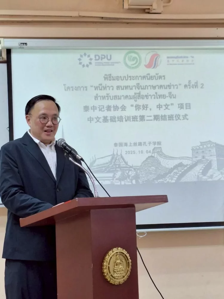 อาจารย์พูลศักดิ์ ประณุทนรพาล ที่ปรึกษาอธิการบดีอาวุโส มหาวิทยาลัยธุรกิจบัณฑิตย์ (DPU) ในฐานะเลขาธิการและกรรมการบริหารสถาบันขงจื่อเส้นทางสายไหมทางทะเล เปิดเผยในพิธีปิดการอบรมภาษาจีนสำหรับสื่อมวลชน ว่า รู้สึกชื่นชมความมุ่งมั่นของผู้เข้าอบรมทุกคนที่แบ่งเวลาในตารางงานอันแน่นขนัดมาพัฒนาทักษะภาษาจีนอย่างต่อเนื่อง จนเห็นพัฒนาการที่ชัดเจนตลอดหลักสูตร โดยบทบาทของสถาบันขงจื่อ และ ห้องเรียนขงจื่อ ถือเป็นกลไกการศึกษาภาษาจีนและวัฒนธรรมที่กระจายอยู่ทั่วโลก รวมถึงหลายจังหวัดในประเทศไทย โดยมีพันธกิจหลักคือ “สอนภาษา–เชื่อมวัฒนธรรม–เปิดโลกทัศน์” ร่วมกับสถาบันเจ้าภาพในครั้งนี้ คือมหาวิทยาลัยธุรกิจบัณฑิตย์ สถาบันขงจื่อฯ DPU ครบรอบ 10 ปีในปีนี้ และจะเดินหน้าขยายความร่วมมือเชิงวิชาการและวัฒนธรรมให้กว้างขวางยิ่งขึ้น