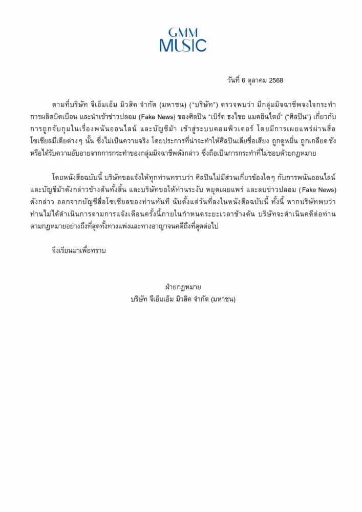โดยหนังสือฉบับนี้ บริษัทขอแจ้งให้ทุกท่านทราบว่า ศิลปินไม่มีส่วนเกี่ยวข้องใดๆ กับการพนันออนไลน์ และบัญชีม้าดังกล่าวข้างต้นทั้งสิ้น และบริษัทขอให้ท่านระงับ หยุดเผยแพร่ และลบข่าวปลอม (Fake News) ดังกล่าว ออกจากบัญชีสื่อโซเชียลของท่านทันที นับตั้งแต่วันที่ลงในหนังสือฉบับนี้ ทั้งนี้ หากบริษัทพบว่า ท่านไม่ได้ดำเนินการตามการแจ้งเตือนครั้งนี้ภายในกำหนดระยะเวลาข้างต้น บริษัทจะดำเนินคดีต่อท่าน ตามกฎหมายอย่างถึงที่สุดทั้งทางแพ่งและทางอาญาจนคดีถึงที่สุดต่อไป