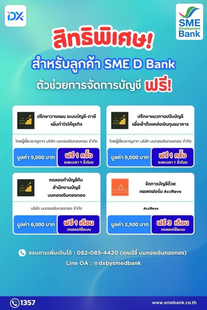 ธนาคารพัฒนาวิสาหกิจขนาดกลางและขนาดย่อมแห่งประเทศไทย (ธพว.) หรือ SME D Bank เดินหน้าเติมเต็มความรู้ด้านการเงิน (Financial Literacy) โดยเฉพาะด้านวางแผนภาษี และการจัดทำบัญชี ให้แก่ผู้ประกอบการเอสเอ็มอี ซึ่งมีความสำคัญอย่างยิ่ง ช่วยสร้างประโยชน์เข้าสู่ระบบภาษีอย่างถูกต้องตามนโยบายรัฐบาล รวมถึง สร้างความน่าเชื่อถือและลดต้นทุนให้ธุรกิจ อีกทั้ง เปิดโอกาสเข้าถึงแหล่งเงินทุนจากสถาบันการเงิน ด้วยการมอบสิทธิประโยชน์มากมาย เพียงสมัครเป็นสมาชิกแพลตฟอร์ม “DX by SME D Bank” (dx.smebank.co.th) บริการพัฒนาธุรกิจครบวงจร ใช้งานง่าย สะดวกทุกที ทุกเวลา ตลอด 24 ชั่วโมง โดยมีสิทธิ์ประโยชน์ต่าง ๆ มากมาย เช่น เข้าพบที่ปรึกษาวางแผนภาษีธุรกิจแบบส่วนตัว จากผู้เชี่ยวชาญ บริษัท บนกองเงินกองทอง จำกัด รูปแบบออนไลน์ ฟรี 1 ครั้ง (มูลค่า 5,000 บาท) หรือแลกสิทธิ์ใช้งานระบบบัญชีออนไลน์ Accrevo ฟรี 3 เดือน (มูลค่า 2,500 บาท)เป็นต้น รวมถึง E-Learning รวบรวมหลักสูตรความรู้ด้านการเงินอีกมากมาย