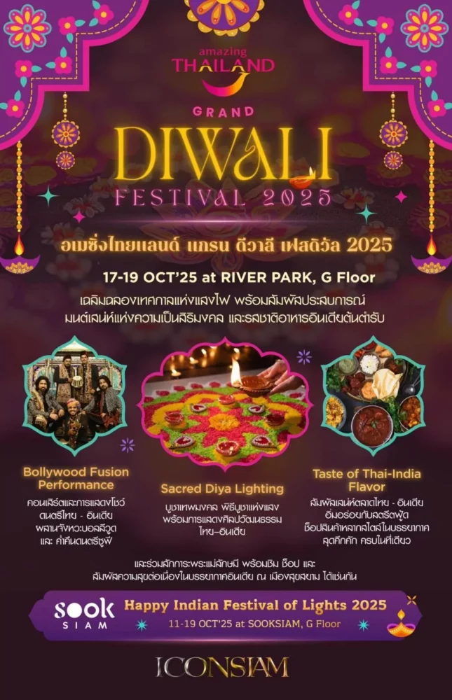 นอกจากนี้ ที่ เมืองสุขสยาม ชั้น G ไอคอนสยาม ยังร่วมฉลองเทศกาลแห่งแสงสว่างอย่างคึกคักกับงาน “Happy Indian Festival of Lights” ระหว่างวันที่ 11–19 ตุลาคม 2568 นำเสนอเมนูอาหารอินเดียต้นตำรับ ขนมหวานสีสันสดใส การแสดงศิลปวัฒนธรรม และกิจกรรมสุดสนุกอย่างการวาดเฮนน่า และถ่ายภาพในชุดซารีสุดงดงาม อีกทั้งยังมีพิธีสักการะ องค์พระแม่ลักษมี เทพีแห่งความรุ่งเรือง ณ ประตูสุขสุวรรณศาลา ซึ่งถือเป็นช่วงเวลาแห่งสิริมงคลที่ทุกคนตั้งตารอ