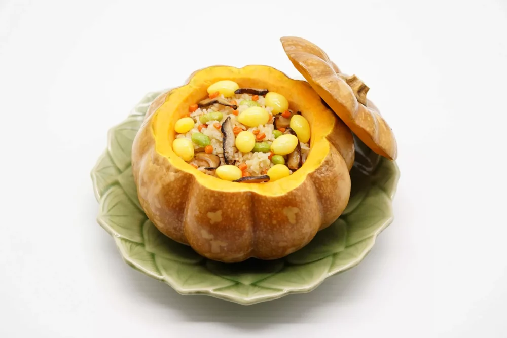 - ข้าวอบฟักทอง เลือกใช้ฟักทองพันธุ์ข้าวตอกมินิ ซึ่งเป็นวัตถุดิบจากเกษตรพื้นบ้าน มีเนื้อเหนียว หวานมัน และมีผิวเรียบเนียนนำมาอบพร้อมกับข้าวที่นำมาผัดกับเห็ดหอม ถั่วแระ แปะก๊วย และพริกหวาน มีรสชาติเค็ม เพื่อตัดกับรสหวานของฟักทอง หลังนำมาอบจะสามารถทานได้ทั้งลูก