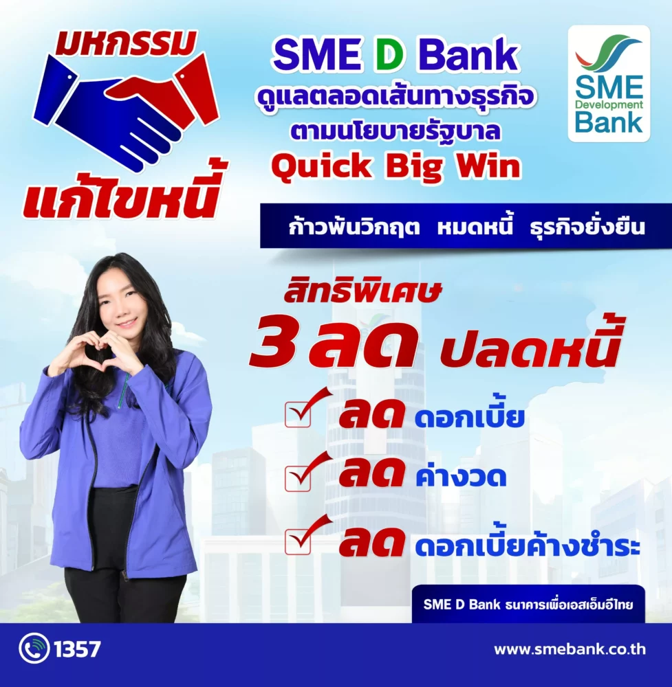 นายพิชิต มิทราวงศ์ กรรมการผู้จัดการ ธนาคารพัฒนาวิสาหกิจขนาดกลางและขนาดย่อมแห่งประเทศไทย (ธพว.) หรือ SME D Bank พร้อมด้วยผู้บริหารและเจ้าหน้าที่ ขับเคลื่อนนโยบายเศรษฐกิจ “Quick Big Win” ของรัฐบาล และกระทรวงการคลัง ในด้านการช่วยเหลือผู้ประกอบการเอสเอ็มอีกลุ่มเปราะบางที่ได้รับผลกระทบจากสถานการณ์เศรษฐกิจโลกและเศรษฐกิจไทยที่เผชิญความไม่แน่นอน ส่งผลกระทบต่อการดำเนินธุรกิจ ทั้งยอดขายที่ลดลง รายได้หดหาย กระทบต่อการชำระคืนหนี้ จัดกิจกรรม “มหกรรมแก้ไขหนี้ : ก้าวพ้นวิกฤต หนี้หมด ธุรกิจยั่งยืน” เมื่อวันที่ 16-17 ตุลาคม 2568 ที่ผ่านมา ณ สำนักงานใหญ่ SME D Bank เพื่อช่วยเหลือผู้ประกอบการเอสเอ็มอีกลุ่มเปราะบาง ให้ลดภาระทางการเงิน สร้างโอกาสพลิกฟื้นธุรกิจกลับมาเดินหน้าได้อีกครั้ง และพร้อมก้าวต่อสู่ความมั่นคงอย่างยั่งยืนในอนาคต