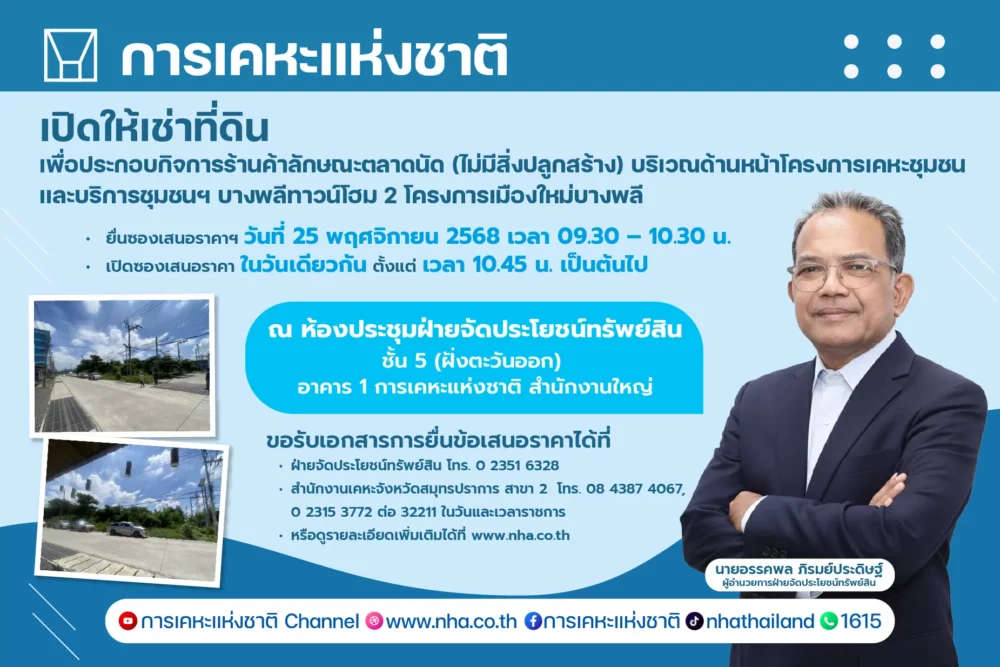 นายอรรคพล ภิรมย์ประดิษฐ์ ผู้อำนวยการฝ่ายจัดประโยชน์ทรัพย์สิน กล่าวว่า การเคหะแห่งชาติเปิดให้เอกชนยื่นข้อเสนอราคาการได้สิทธิเช่าที่ดิน เพื่อประกอบกิจการร้านค้าลักษณะตลาดนัด (ไม่มีสิ่งปลูกสร้าง) พร้อมกิจกรรมต่อเนื่อง บริเวณด้านหน้าโครงการเคหะชุมชนและบริการชุมชนฯ บางพลีทาวน์โฮม 2 ในโครงการเมืองใหม่บางพลี ขนาดเนื้อที่ประมาณ 2-2-6.8 ไร่ ตั้งอยู่บริเวณถนนเทพารักษ์ หมู่ที่ 6 ตำบลบางเสาธง อำเภอบางเสาธง จังหวัดสมุทรปราการ เพื่อให้เกิดความโปร่งใสในการดำเนินงานทุกขั้นตอนตามหลักธรรมาภิบาล การเคหะแห่งชาติจึงเปิดโอกาสให้เอกชนที่สนใจสามารถยื่นข้อเสนอราคาการได้สิทธิเช่าที่ดินดังกล่าว โดยมีอัตราค่าธรรมเนียมการได้สิทธิเช่าขั้นต่ำไม่น้อยกว่า 600,000 บาท ระยะเวลาการให้สิทธิเช่า 3 ปี (ทำสัญญาคราวเดียว) ในอัตราค่าเช่ารายเดือน ปีที่ 1 เดือนละ 77,200 บาท (ปลอดค่าเช่า 3 เดือนแรก) ปีที่ 2 เดือนละ 79,600 บาท ปีที่ 3 เดือนละ 82,000 บาท กำหนดหลักประกันการยื่นซองเสนอราคาจำนวน 100,000 บาท กำหนดเงินประกันการปฏิบัติตามสัญญา จำนวน 3 เท่าของค่าเช่ารายเดือนปีสุดท้าย เป็นเงิน 246,000 บาท โดยกำหนดวันยื่นข้อเสนอราคาฯ ในวันที่ 25 พฤศจิกายน 2568 เวลา 09.30 – 10.30 น. และกำหนดเปิดซองเสนอราคาในวันเดียวกัน ตั้งแต่เวลา 10.45 น. เป็นต้นไป ณ ห้องประชุมฝ่ายจัดประโยชน์ทรัพย์สิน ชั้น 5 (ฝั่งตะวันออก) อาคาร 1 การเคหะแห่งชาติ แขวงคลองจั่น เขตบางกะปิ กรุงเทพมหานคร