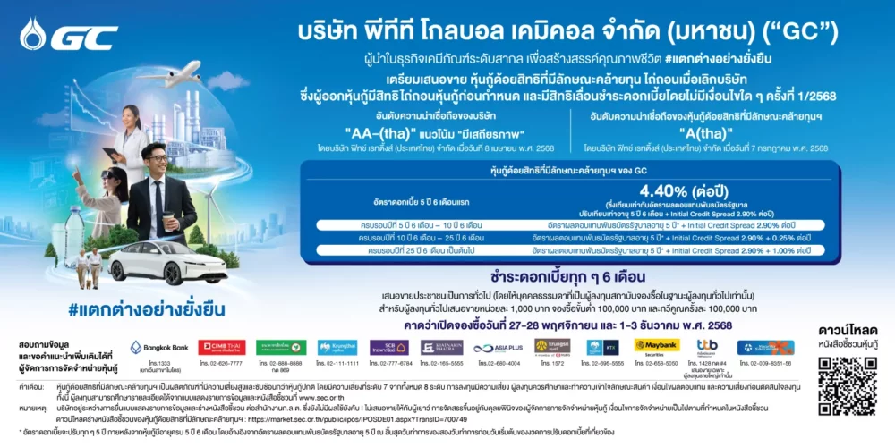บริษัท พีทีที โกลบอล เคมิคอล จำกัด (มหาชน) หรือ GC ผู้นำในธุรกิจเคมีภัณฑ์ระดับสากล และแกนนำธุรกิจเคมีภัณฑ์ของกลุ่ม ปตท. ประกาศดอกเบี้ยหุ้นกู้ด้อยสิทธิที่มีลักษณะคล้ายทุน ไถ่ถอนเมื่อเลิกบริษัท ซึ่งผู้ออกหุ้นกู้มีสิทธิไถ่ถอนหุ้นกู้ก่อนกำหนด (“หุ้นกู้ด้อยสิทธิที่มีลักษณะคล้ายทุนฯ”) สำหรับ 5 ปี 6 เดือนแรกที่ 4.40% ต่อปี คาดเสนอขายต่อผู้ลงทุนทั่วไป (Public offering) ระหว่างวันที่ 27 – 28 พฤศจิกายน และ 1 – 3 ธันวาคม 2568 ผ่าน 12 สถาบันการเงิน