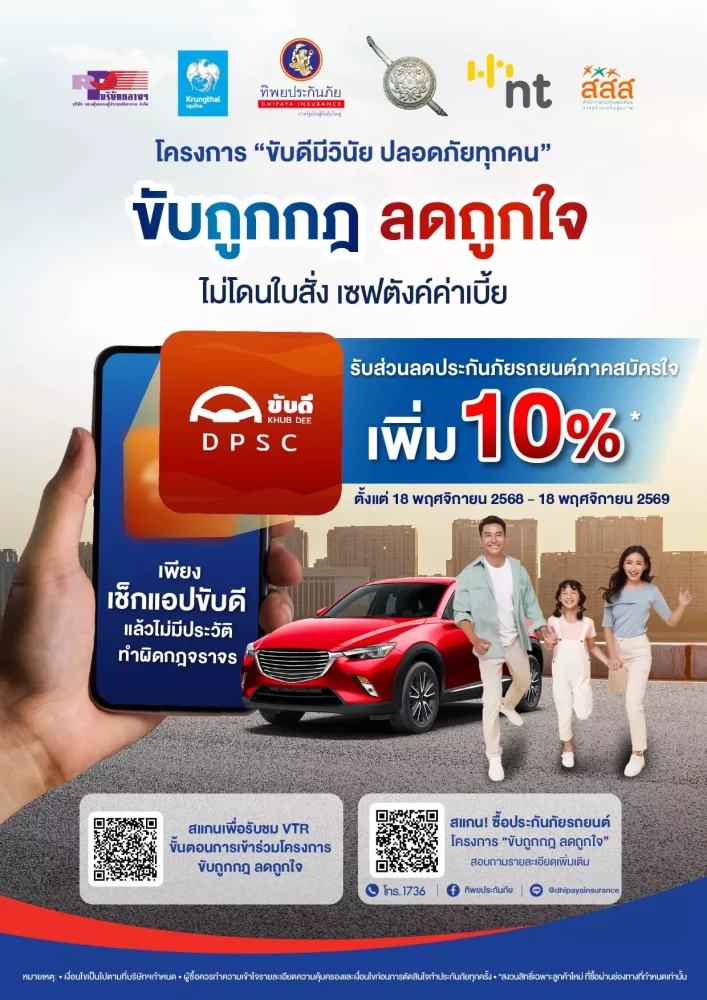 บริษัท ทิพยประกันภัย จำกัด (มหาชน) ร่วมกับ สำนักงานตำรวจแห่งชาติ บริษัท กลางคุ้มครองผู้ประสบภัยจากรถ บริษัท โทรคมนาคมแห่งชาติ จำกัด (มหาชน) ธนาคารกรุงไทย จำกัด (มหาชน) และสำนักงานกองทุนสนับสนุนการสร้างเสริมสุขภาพ (สสส.) ผนึกกำลังเดินหน้าเสริมสร้างความปลอดภัยบนท้องถนน พร้อมมอบสิทธิประกันภัยพิเศษภายใต้โครงการ “ขับดีมีวินัย ปลอดภัยทุกคน” เพื่อส่งเสริมให้ประชาชนตระหนักถึงความปลอดภัยทางถนน เคารพกฎจราจร และเข้าถึงความคุ้มครองด้านประกันภัยได้สะดวกยิ่งขึ้นผ่านดิจิทัลแพลตฟอร์ม