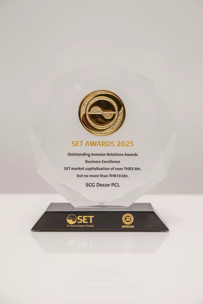 บริษัท เอสซีจี เดคคอร์ จำกัด (มหาชน) หรือ SCGD  คว้ารางวัล Outstanding Investor Relations Awards จากเวที SET Awards 2025 ซึ่งจัดโดยตลาดหลักทรัพย์แห่งประเทศไทยร่วมกับวารสารการเงินธนาคาร สะท้อนถึงความมุ่งมั่นของบริษัทในการสร้างความเชื่อมั่นให้กับนักลงทุนผ่านการให้ข้อมูลและการดำเนินกิจกรรมนักลงทุนสัมพันธ์ครบถ้วน โปร่งใส รางวัลนี้ ยังสะท้อนถึงบทบาทของผู้บริหารในการให้ความสำคัญและสนับสนุนงานด้านนักลงทุนสัมพันธ์อย่างต่อเนื่อง ส่งผลให้ SCGD สามารถขับเคลื่อนงานด้านการสื่อสารและสนับสนุนงานด้านนักลงทุนสัมพันธ์ได้อย่างมีประสิทธิภาพ