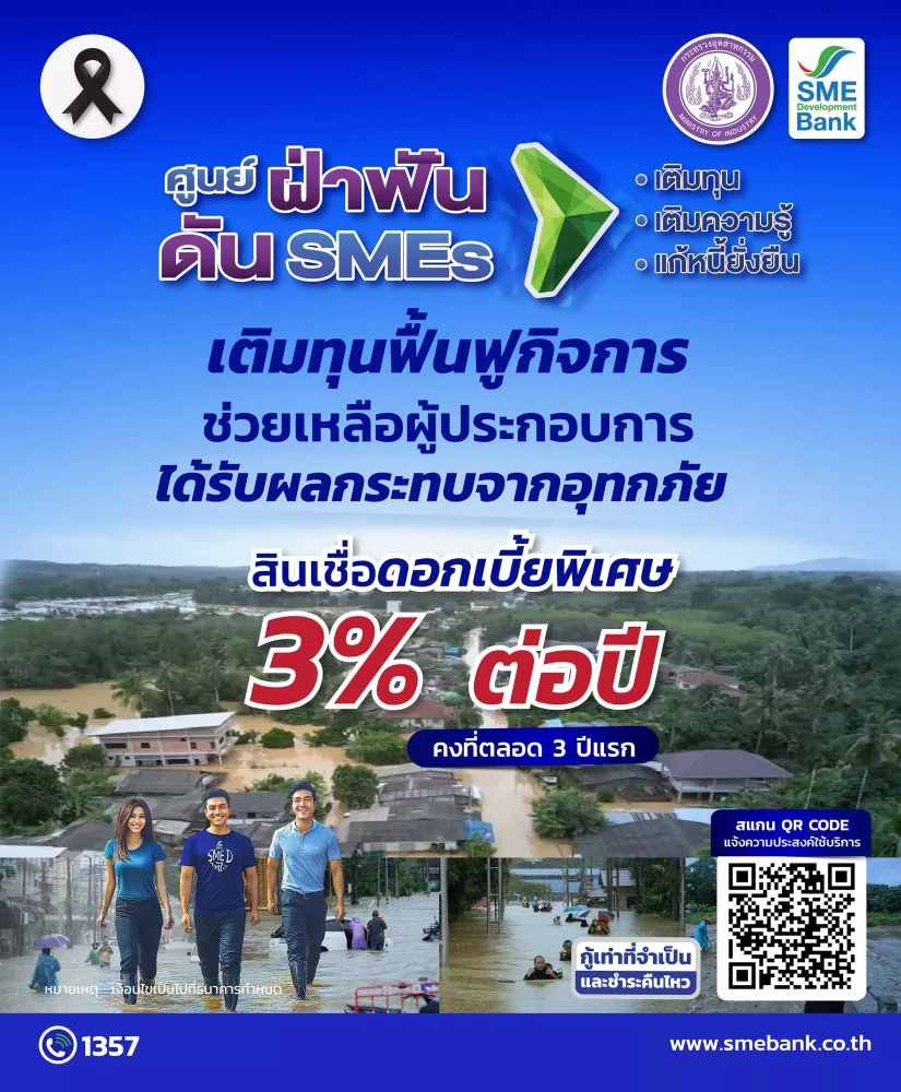 นายพิชิต มิทราวงศ์ กรรมการผู้จัดการ ธนาคารพัฒนาวิสาหกิจขนาดกลางและขนาดย่อมแห่งประเทศไทย (ธพว.) หรือ SME D Bank กล่าวว่า จากสถานการณ์อุทกภัยที่เกิดขึ้นในพื้นที่ภาคใต้ ส่งผลกระทบต่อการดำเนินธุรกิจและสร้างความเสียหายให้แก่ผู้ประกอบการเอสเอ็มอีในพื้นที่อย่างรุนแรง ดังนั้น SME D Bank ได้ออกมาตรการช่วยเหลือระยะเร่งด่วนไปแล้ว และเพื่อขยายความช่วยเหลือให้กว้างขวางยิ่งขึ้น โดยเฉพาะรองรับหลังสถานการณ์อุทกภัยคลี่คลาย ซึ่งผู้ประกอบการเอสเอ็มอี มีความจำเป็นต้องการเงินทุนเพิ่มเติม เพื่อเสริมสภาพคล่อง ลงทุน ซ่อมแซม ปรับปรุง หรือยกระดับฟื้นฟูกิจการให้กลับมาเดินหน้าได้โดยเร็ว ธนาคารร่วมกับ “สมาพันธ์ SME ไทย” ซึ่งมีเครือข่ายผู้ประกอบการเอสเอ็มอีจำนวนมากอยู่ในทุกพื้นที่ทั่วประเทศ โดยจะเชื่อมโยงการสนับสนุนผู้ประกอบการเอสเอ็มอีในพื้นที่ภาคใต้ ทั้งที่เป็นสมาชิกของสมาพันธ์ SME ไทย และทั่วไป เข้าถึงแหล่งทุนเพื่อฟื้นฟูกิจการ ด้วยอัตราดอกเบี้ยต่ำพิเศษเพียงแค่ 3% ต่อปี คงที่ตลอด 3 ปีแรก ผ่อนชำระนานสูงสุด 10 ปี ปลอดชำระหนี้เงินต้นสูงสุด 12 เดือน วงเงินกู้สูงสุด 15 ล้านบาท