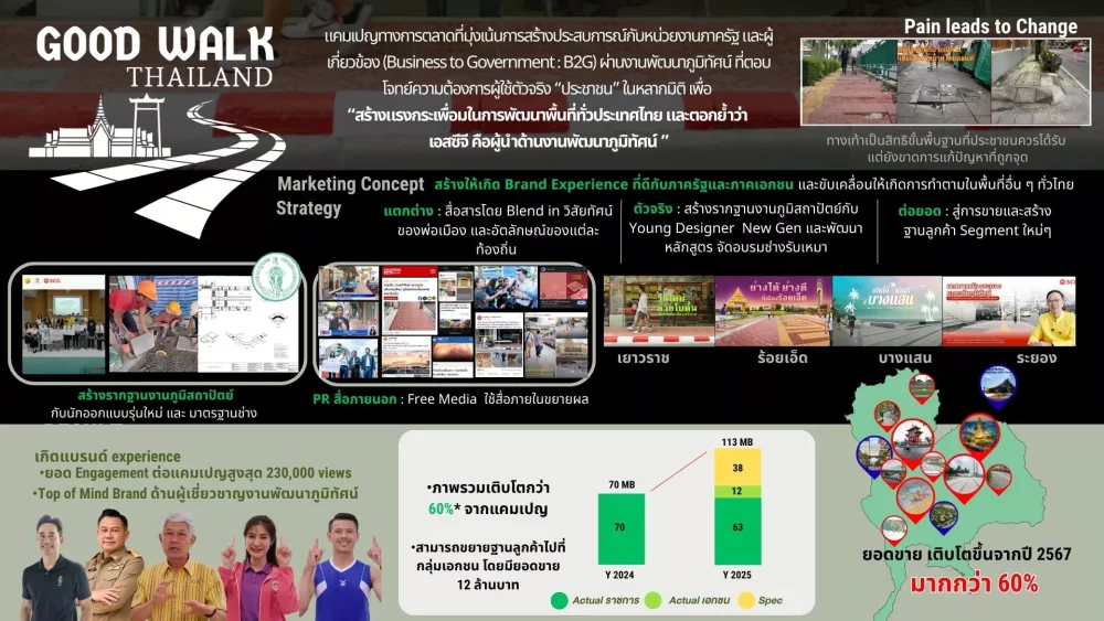 Good Walk Thailand ไม่เพียงเป็นแคมเปญที่ช่วยพัฒนาภูมิทัศน์เท่านั้น แต่ยังเป็นการขับเคลื่อนคุณภาพชีวิตประชาชน ส่งเสริมเศรษฐกิจในชุมชน พร้อมตอกย้ำบทบาท SCG ในฐานะผู้นำด้านงานพัฒนาภูมิทัศน์ของประเทศ