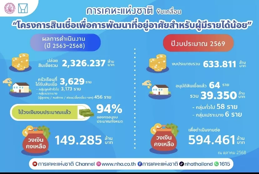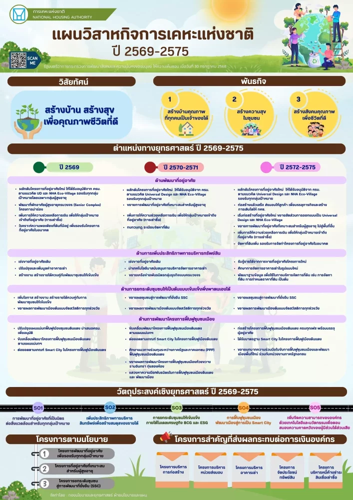 พร้อมกันนี้ การเคหะแห่งชาติเตรียมยกระดับการบริหารจัดการอาคารเช่ากว่า 66,000 หน่วย เพื่อพัฒนาคุณภาพการให้บริการ การดูแลรักษา และสภาพแวดล้อมโดยรอบให้ได้มาตรฐานสร้างความมั่นคงในการอยู่อาศัยให้กับพี่น้องประชาชนในระยะยาว ตลอดจนเดินหน้าโครงการสินเชื่อเพื่อการพัฒนาที่อยู่อาศัย และปล่อยสินเชื่อแล้วกว่า 2,300 ล้านบาท ในปี 2569 การเคหะแห่งชาติได้จัดเตรียมวงเงินเพื่อปล่อยสินเชื่อให้กับประชาชนเพิ่มเติมอีกมากกว่า 594 ล้านบาท เพื่อรองรับความต้องการด้านที่อยู่อาศัย โดยเฉพาะในกลุ่มพี่น้องประชาชนที่ถูกปฏิเสธสินเชื่อจากสถาบันการเงิน เพื่อเพิ่มโอกาสและช่องทางในการเข้าถึงที่อยู่อาศัยให้ได้มากที่สุด ด้านการพัฒนาชุมชน การเคหะแห่งชาติมุ่งมั่นขับเคลื่อนโมเดล BCG และ ESG ใน 35 ชุมชนทั่วประเทศ เพื่อส่งเสริมการจัดการขยะ ลดมลภาวะ เพิ่มพื้นที่สีเขียว และสร้างความร่วมมือในชุมชนให้เข้มแข็งและยั่งยืน