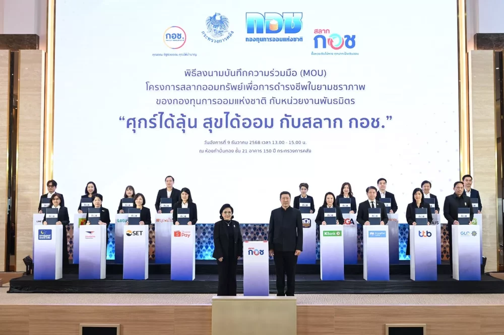วันที่ 9 ธันวาคม 2568 กองทุนการออมแห่งชาติ (กอช.) จัดงานแถลงข่าวบันทึกความร่วมมือ (MOU) โครงการสลากออมทรัพย์เพื่อการดำรงชีพในยามชราภาพของกองทุนการออมแห่งชาติ กับหน่วยงานพันธมิตร “ศุกร์ได้ลุ้น สุขได้ออม กับสลาก กอช.” เพื่อยกระดับการออมของคนไทยเข้าสู่การออมผ่านดิจิทัล ที่สะดวก รวดเร็ว ครอบคลุมทุกช่องทาง ทุกพื้นที่ พร้อมลุ้นรางวัลใหญ่ 1 ล้านบาททุกสัปดาห์ ณ ห้องกำปั่นทอง ชั้น 21 อาคาร 150 ปี กระทรวงการคลัง โดยภายในงานยังได้เปิดตัวแอปพลิเคชัน กอช. รูปแบบใหม่ ที่จะสามารถทำธุรกรรม เปิดบัญชี ติดตามเงินออม ข้อมูลข่าวสารของสมาชิก กอช. รวมถึงการจำหน่ายสลาก กอช. ในอนาคตด้วย