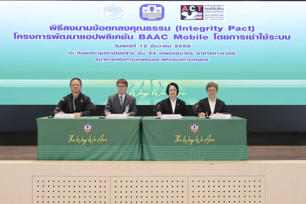 นายทองคำ เกตุโชติ รองผู้จัดการธนาคารเพื่อการเกษตรและสหกรณ์การเกษตร (ธ.ก.ส.) ร่วมลงนามข้อตกลงคุณธรรม “โครงการพัฒนาแอปพลิเคชัน BAAC Mobile โดยการเช่าใช้ระบบ” ระหว่าง ธ.ก.ส. กรมบัญชีกลาง และองค์กรต่อด้านคอร์รัปชัน (ประเทศไทย) เพื่อพัฒนาและยกระดับแอปพลิเคชัน BAAC Mobile รูปแบบใหม่ภายใต้มาตรฐานที่สูงยิ่งขึ้น ทั้งด้านเทคโนโลยี และความปลอดภัย รวมถึงดำเนินโครงการภายใต้ข้อตกลงคุณธรรม (Integrity Pact) เพื่อช่วยให้กระบวนการจัดซื้อจัดจ้างเป็นไปด้วยความโปร่งใสและเป็นระบบซึ่งมีผู้สังเกตการณ์อิสระติดตามตรวจสอบตั้งแต่เริ่มต้นจนสิ้นสุดขั้นตอน ซึ่งช่วยเสริมความน่าเชื่อถือ และสะท้อนว่าธนาคารดำเนินงานบนหลักธรรมาภิบาลอย่างแท้จริง ข้อตกลงดังกล่าวจึงเป็นกลไกสำคัญที่สนับสนุนความสำเร็จของโครงการขนาดใหญ่ และช่วยให้การใช้ทรัพยากรของรัฐเกิดประโยชน์สูงสุด ซึ่งนับเป็นอีกหนึ่งก้าวสำคัญของ ธ.ก.ส. ในการขับเคลื่อนพันธกิจของธนาคารในการเป็นศูนย์กลางทางการเงินที่ให้บริการครบวงจรและทันสมัย ตอบโจทย์การใช้งานของเกษตรกร ลูกค้าและประชาชนผู้ใช้บริการทั่วประเทศได้อย่างมั่นคงและมีประสิทธิภาพในทุกมิติ โดยมีคณะผู้บริหาร พนักงาน และส่วนงานที่เกี่ยวข้อง เข้าร่วมกิจกรรม ณ ห้องประชุมจำเนียรสาร ชั้น 24 เกษตรธนากร อาคารทาวเวอร์ เมื่อวันที่ 12 ธันวาคม 2568