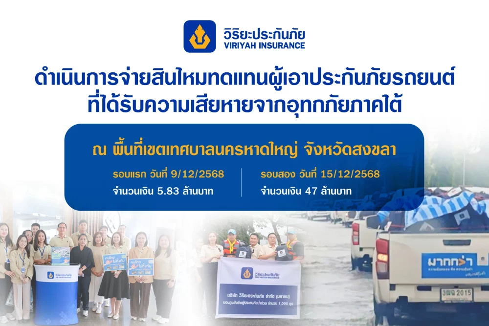 “บริษัทฯ ได้เร่งดำเนินการจ่ายสินไหมทดแทนให้แก่ลูกค้าที่ได้รับผลกระทบอย่างต่อเนื่อง ทั้งนี้ ตามรายงานของศูนย์ปฏิบัติการสินไหมทดแทนวิริยะประกันภัยในพื้นที่ภาคใต้ ณ ปัจจุบัน มีรถยนต์ที่ได้รับความเสียหายจากน้ำท่วมประมาณ 4,300 คัน โดยพื้นที่ที่ได้รับผลกระทบมากที่สุด คือ เขตเทศบาลนครหาดใหญ่ จำนวน 3,800 คัน บริษัทฯ จึงได้ระดมเจ้าหน้าที่ดำเนินงานเร่งรัดตรวจสอบและพิจารณาเอกสารประกอบการเคลมทุกวัน ตลอด 24 ชั่วโมง โดยเบื้องต้นบริษัทฯ ได้ดำเนินการจ่ายสินไหมทดแทนให้แก่ผู้เอาประกันภัย รอบแรก ณ วันที่ 9 ธันวาคม 2568 เป็นการคืนทุนประกันภัยเต็มจำนวนตามที่ระบุไว้ในกรมธรรม์ ซึ่งเป็นรถสันดาปทั้งหมด เป็นเงินจำนวน 5.83 ล้านบาท รอบถัดไปในวันที่ 15 ธันวาคม 2568 สำหรับเคสที่มีเอกสารประกอบการเรียกร้องค่าสินไหมทดแทนครบถ้วน เป็นเงินจำนวน 47 ล้านบาท และจนถึงสิ้นปี 2568 คาดว่าจะจ่ายสินไหมฯ แล้วเสร็จ โดยบริษัทฯ ขอยืนยันความมุ่งมั่นในการดูแลผู้เอาประกันภัยทุกท่านให้ได้รับการชดเชยอย่างครบถ้วน รวดเร็ว และเป็นธรรมสูงสุด” คุณณัฐพงศ์กล่าว