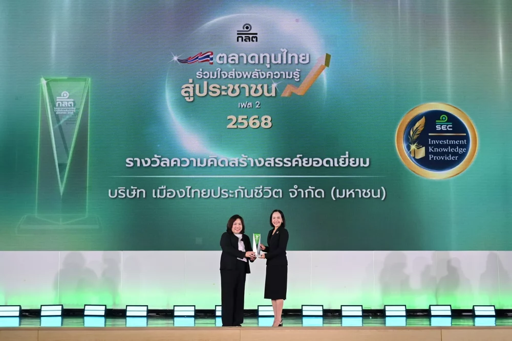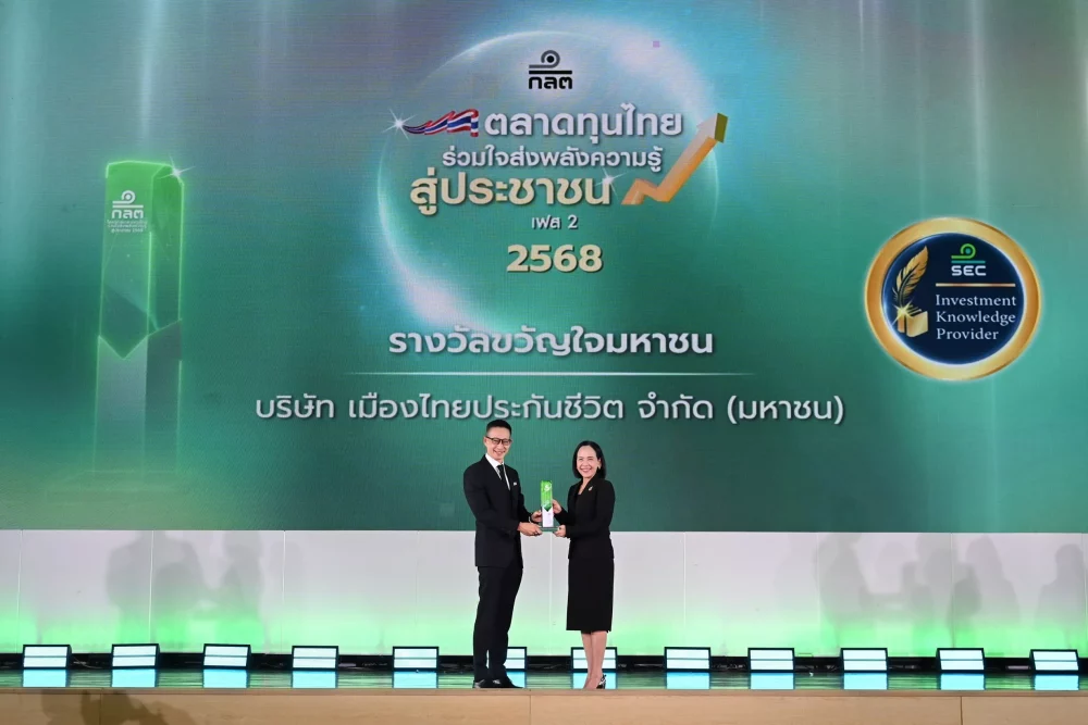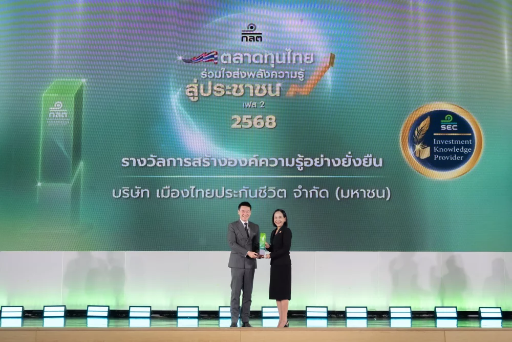 บริษัท เมืองไทยประกันชีวิต จำกัด (มหาชน) คว้า 4 รางวัล จากโครงการ “ตลาดทุนไทยร่วมใจส่งพลังความรู้ สู่ประชาชน เฟส 2 ปี 2568” ซึ่งจัดโดยสำนักงานคณะกรรมการกำกับหลักทรัพย์และตลาดหลักทรัพย์ (ก.ล.ต.) สะท้อนบทบาทขององค์กรในการขับเคลื่อนการพัฒนาความรู้ด้านการเงิน การประกัน และการลงทุน (Financial and Insurance Literacy) ให้แก่ประชาชนไทยอย่างเป็นรูปธรรม ภายใต้กรอบการพัฒนาที่ยั่งยืน (ESG) และความรับผิดชอบต่อสังคมในการเสริมสร้างภูมิคุ้มกันทางการเงินในระยะยาว