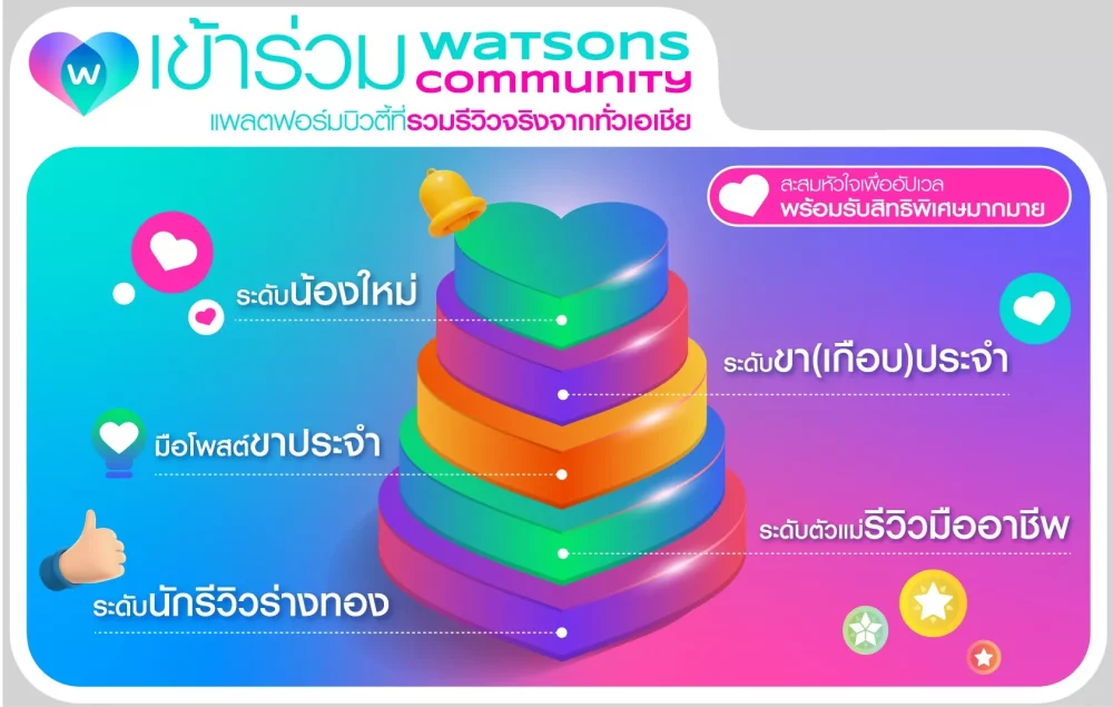 - ร่วมแบ่งปัน Watsons Community มันคือ พื้นที่สร้างสรรค์สำหรับทุกคน เริ่มต้นสร้างโปรไฟล์ของคุณ เพื่อรีวิวสินค้าที่ชื่นชอบ ถามข้อสงสัยเกี่ยวกับบิวตี้ไอเทม หรือแชร์ทริคการดูแลตัวเอง พร้อมสะสมคะแนนและเลื่อนระดับสู่การเป็นที่สุดของนักรีวิวร่างทอง เพื่อแลกรับของรางวัลมากมาย อาทิ สกินแคร์ & บิวตี้ไอเท็มมากมายจากแบรนด์ชั้นนำ