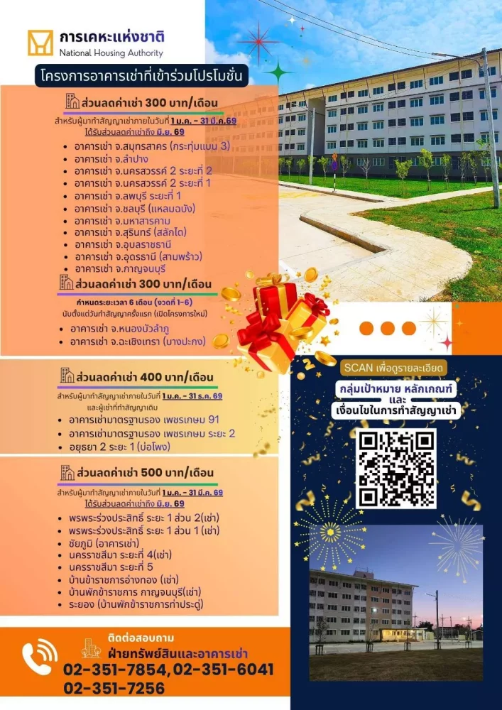 ขณะเดียวกัน ยังจัดโปรโมชันลดค่าเช่าโครงการที่พักอาศัยทั่วประเทศ 24 โครงการ จำนวน 300-500 บาทต่อหน่วยต่อเดือน จากค่าเช่าเดือนละ 1,260 – 2,500 บาท เริ่มตั้งแต่เดือนมกราคม 2569 ถึง 31 ธันวาคม 2569 มีเป้าหมายช่วยลดภาระค่าครองชีพ พัฒนาคุณภาพชีวิต และเพิ่มโอกาสในการเข้าถึงที่อยู่อาศัย โดยเฉพาะกลุ่มเปราะบางให้เข้าถึงที่พักอาศัยอย่างเท่าเทียม กำหนดระยะเวลา 6 เดือน