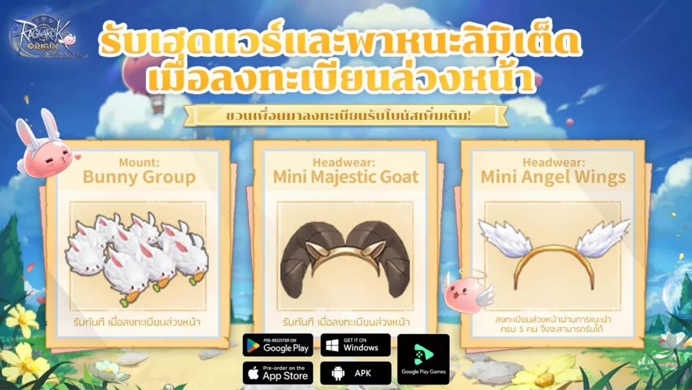เกมเปิดให้ลงทะเบียนล่วงหน้าแล้ววันนี้ หลังจากลงทะเบียนล่วงหน้าสำเร็จ จะได้รับพาหนะ “Bunny Group” เฮดแวร์ “Majestic Goat” และยังมีโอกาสลุ้นรางวัล iPhone 17 Pro อีกด้วย! รีบมาลงทะเบียนล่วงหน้ากันเลย https://roocpr.short.gy/th0202