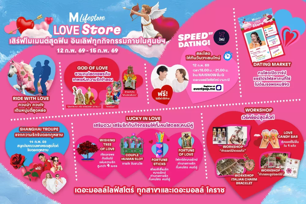 - Speed Dating โดย เดอะมอลล์ไลฟ์สโตร์ ร่วมกับ OMG MATCHMAKING จัดตลาดนัดหาคู่ ตามเทรนด์การหาคู่แบบใหม่ “เซี่ยงไฮ้ โมเดล” โดยเปิดโอกาสให้คนโสดได้เลือกคู่เดทได้พูดคุย เจอตัวกันตั้งแต่ครั้งแรก ภายในงานพบกับคนโสด 40 คน ที่จะมาเดทแลกเปลี่ยนมุมมอง ทำความรู้จักเพื่อตามหาคนที่ใช่ ในวันพฤหัสบดีที่ 12 กุมภาพันธ์ 2569 เวลา 18.00 น. เป็นต้นไปที่ร้าน Naisnow เดอะมอลล์ไลฟ์สโตร์ บางกะปิ