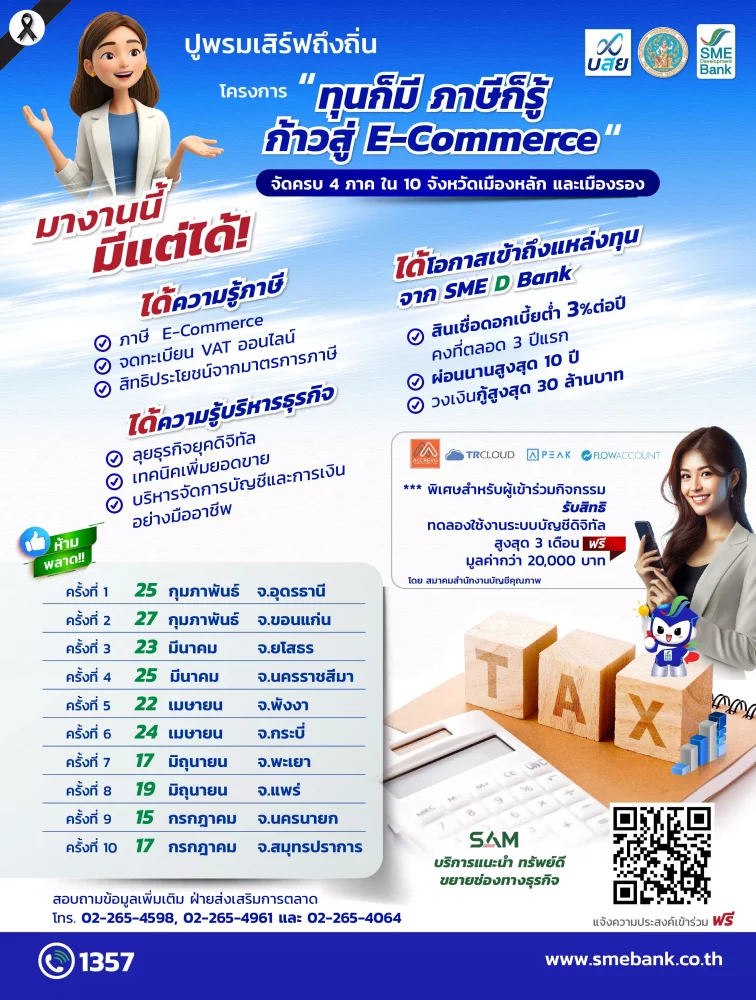 SME D Bank เดินหน้าภารกิจธนาคารเพื่อการพัฒนา ผนึกกำลัง กรมสรรพากร และ บสย. ลุยโครงการ “ทุนก็มี ภาษีก็รู้ ก้าวสู่ E-Commerce” ปูพรมเสริมแกร่งเอสเอ็มอีให้ก้าวทันการดำเนินธุรกิจในยุคดิจิทัล ผ่านการจัดงานในรูปแบบ ONE Stop Service เติมเต็มความรู้การเงิน ใช้ประโยชน์จากภาษี  เพิ่มทักษะขยายตลาดอีคอมเมิร์ซ และผลักดันเข้าถึงแหล่งทุนดอกเบี้ยพิเศษ ไม่ต้องใช้หลักทรัพย์ค้ำประกัน  กำหนดจัด 10 ครั้ง ใน 10 จังหวัดทั่วประเทศ  ระหว่างเดือน ก.พ.-ก.ค. 2569 นี้  เปิดกว้างเข้าร่วมฟรี ไม่มีค่าใช้จ่ายใดๆ ทั้งสิ้น