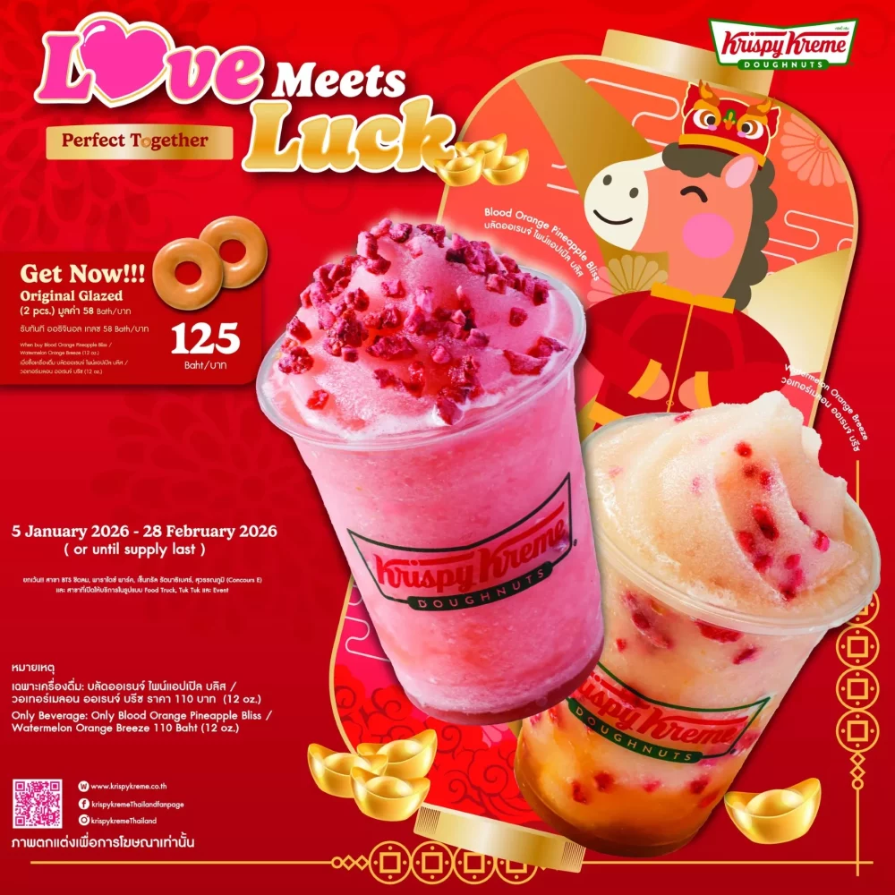 นอกจากนี้ยังมีโปรโมชั่นเครื่องดื่ม Love Meet Luck เติมพลังดีๆ จาก Krispy Kreme ต้อนรับปีมะเมียด้วยความเฮงพร้อมความสดใส กับสองเมนูปั่นสีมงคล ความหมายดี ที่หอมละมุนกลิ่นจัสมินทีอ่อน ๆ พร้อมสตรอว์เบอร์รีฟรีซดรายเพิ่มความพิเศษ ได้แก่ เมนู Blood Orange Pineapple Bliss ให้รสเปรี้ยวหวานสดชื่นจากส้มและสับปะรด เป็นแก้วที่แทนความโชคดีและพลังบวก รับปีใหม่อย่างสดใส และเมนู Watermelon Orange Breeze สดชื่นเบาสบายจากส้มและแตงโมสีสวย หวานละมุน เสริมความรักและความสมดุลให้ทุกวันของคุณ ราคาแก้วละ 110 บาท จับคู่ความฟิน เมื่อซื้อเครื่องดื่ม Blood Orange Pineapple Bliss หรือ Watermelon Orange Breeze ในราคาแก้วละ 125 บาท รับทันที! Original Glazed 2 ชิ้น มูลค่า 58 บาท ตั้งแต่วันนี้จนถึง 28 ก.พ. 69