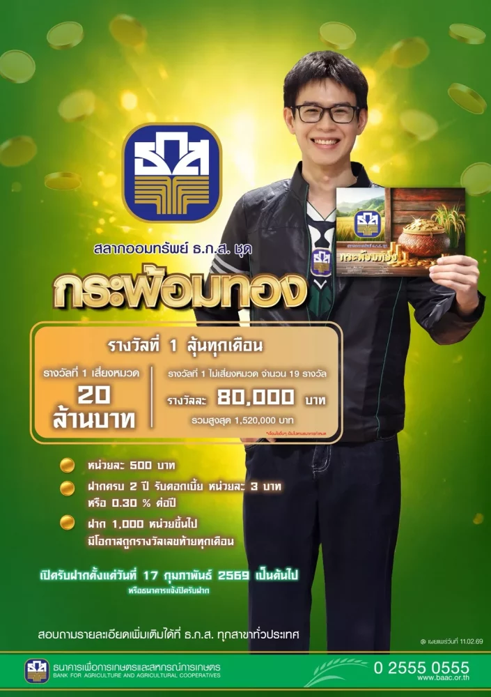ธ.ก.ส. เปิดตัวซีรีส์ “สลากออมทรัพย์ ธ.ก.ส.” รับความรวยในเทศกาลตรุษจีน 2569 ในชุดกระพ้อมทอง หน่วยละ 500 บาท ให้ลุ้นโชคใหญ่ 20 ล้านบาท และรางวัลอื่น ๆ รวมมูลค่ากว่า 86 ล้านบาทต่อเดือน จำนวน 24 ครั้ง เมื่อฝากครบ 2 ปี ได้รับดอกเบี้ยหน่วยละ 3 บาท และชุดกระพ้อมเงิน หน่วยละ 100 บาท ลุ้นรางวัลใหญ่ 10 ล้านบาท ที่มาพร้อมรางวัลพิเศษอีกรางวัลละ 1 ล้านบาท ปีละ 3 ครั้ง รวม 30 ล้านบาท และรางวัลอื่น ๆ รวมมูลค่ากว่า 109 ล้านบาทต่อเดือน จำนวน 24 ครั้ง ฝากครบ 2 ปี รับดอกเบี้ยหน่วยละ 0.25 บาท เงินรางวัลได้รับการยกเว้นภาษีสำหรับบุคคลธรรมดา เปิดรับฝากตั้งแต่วันนี้เป็นต้นไป ผ่านแอปพลิเคชัน BAAC Mobile และ ธ.ก.ส. ทุกสาขา