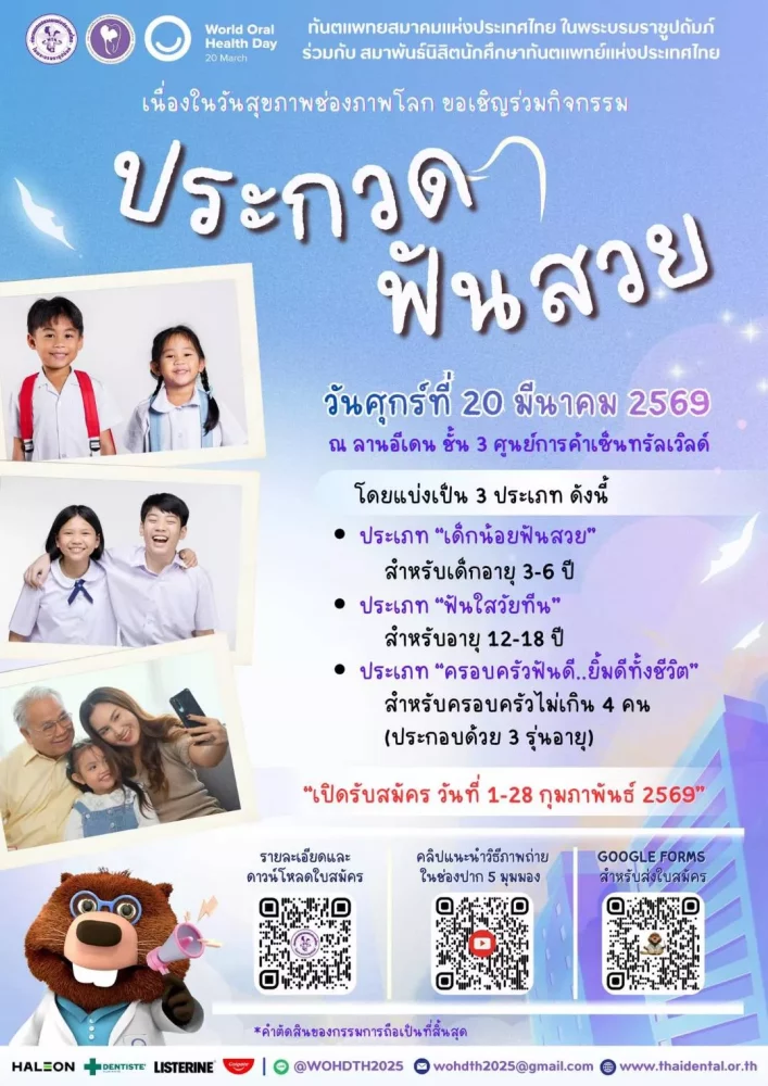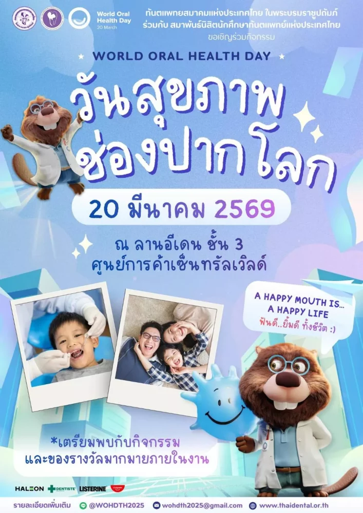 ทันตแพทยสมาคมฯ ชวนร่วมงาน World Oral Health Day 2026 จัดประกวดสุขภาพฟันดี สนุกกับกิจกรรม และของรางวัลมากมาย 20 มี.ค. นี้ ที่เซ็นทรัลเวิลด์