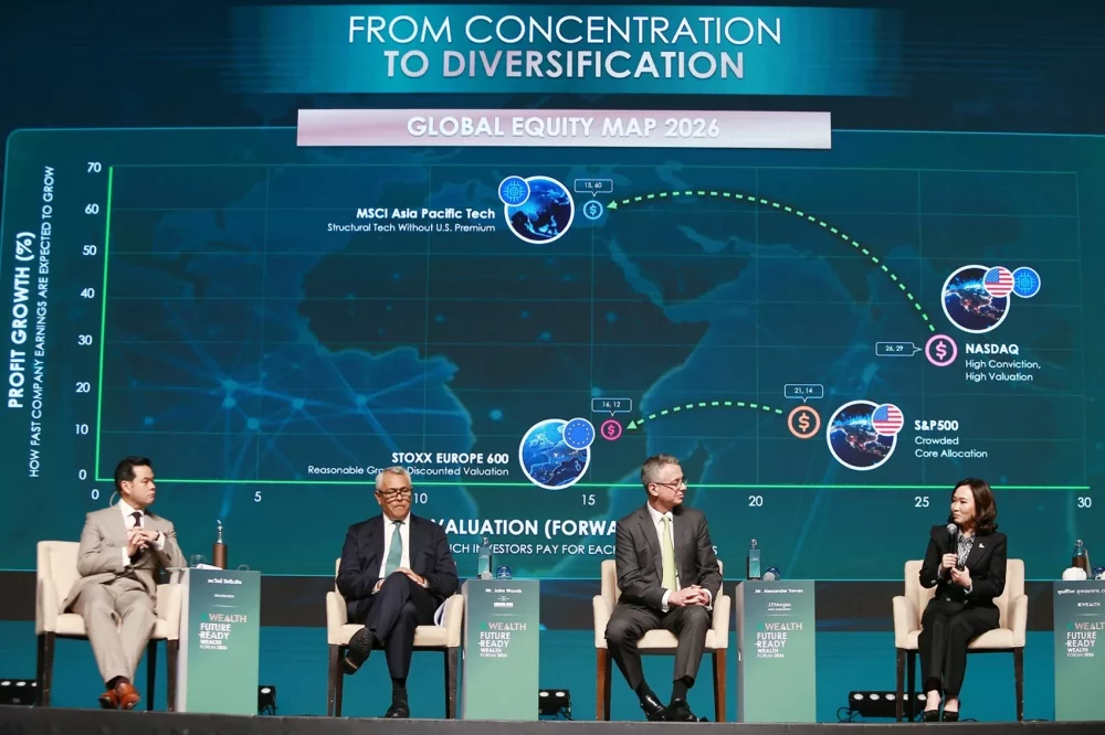 บทบาทของ K WEALTH ในวันนี้จึงไม่ใช่เพียงเรื่องผลิตภัณฑ์ทางการเงิน แต่เป็นพันธมิตรเชิงกลยุทธ์ (Strategic Partner) ในการบริหารความมั่งคั่งให้กับลูกค้าเพื่อให้สามารถรับมือระเบียบโลกใหม่ ประกอบด้วย 3 แกนหลัก ได้แก่ 1) Diversification สร้างระบบกระจายพอร์ตที่สมดุลและยืดหยุ่น เพื่อให้พอร์ต “ไม่เปราะบาง” ในทุกสถานการณ์ 2) Downside Awareness เน้นบริหารความเสี่ยงผ่านฉากทัศน์ต่าง ๆ (Scenarios) ปกป้องเงินลงทุนในยามตลาดผันผวนแทนการไล่ล่าจังหวะทำกำไรสูงสุด 3) Long-term Discipline ยึดมั่นวินัยการลงทุนระยะยาว เพื่อเอาชนะแรงกดดันจากอารมณ์และข้อมูลที่ล้นทะลัก