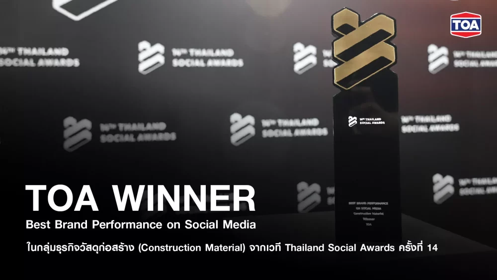 วันที่ 25 กุมภาพันธ์ 2569 บริษัท ทีโอเอ เพ้นท์ (ประเทศไทย) จำกัด (มหาชน) หรือ TOA ผู้นำอุตสาหกรรมสีอันดับ 1 เคมีภัณฑ์ก่อสร้าง และวัสดุตกแต่งพื้นผิวครบวงจรของไทย ประกาศความสำเร็จบนโลกดิจิทัลอย่างยิ่งใหญ่ คว้ารางวัลชนะเลิศอันดับหนึ่ง “Best Brand Performance on Social Media” ในกลุ่มธุรกิจวัสดุก่อสร้าง (Construction Material) จากงานประกาศรางวัลโซเชียลที่ใหญ่ที่สุดในประเทศไทย ‘Thailand Social Awards ครั้งที่ 14’ ตอกย้ำกลยุทธ์ Content Strategy ที่ครองใจผู้บริโภคยุคใหม่ ในโอกาสนี้ นายนพคุณ ปัญญาเสริมสุข Head of Marketing บริษัท ทีโอเอ เพ้นท์ (ประเทศไทย) จำกัด (มหาชน) เป็นตัวแทนขึ้นรับรางวัล โดยมี นายกล้า ตั้งสุวรรณ ประธานเจ้าหน้าที่บริหาร บริษัท ไวซ์ไซท์ (ประเทศไทย) จำกัด ร่วมแสดงความยินดี ณ ทรูไอคอน ฮอลล์ ชั้น 7 ไอคอนสยาม