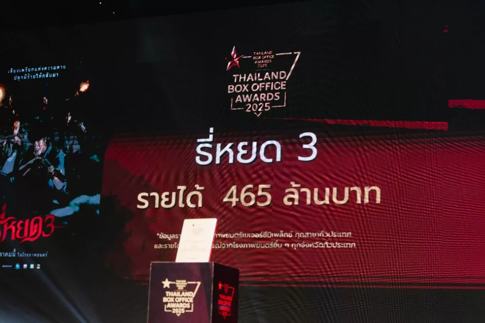 M Studio และ ช่อง 3 สร้างสถิติครั้งสำคัญให้วงการภาพยนตร์ไทย หลังภาพยนตร์ “ธี่หยด 3” ทำรายได้รวมทั่วประเทศ 465 ล้านบาท คว้ารางวัลภาพยนตร์ที่มีรายได้สูงสุดแห่งปี 2025 จากเวทีThailand Box Office Awards 2025 ที่จัดขึ้นเพื่อยกย่องภาพยนตร์ไทยที่ประสบความสำเร็จทั้งด้านรายได้และคุณภาพการผลิต ณ โรงละครอักษรา คิง เพาเวอร์ ซึ่งตอกย้ำความแข็งแรงของแฟรนไชส์ที่สามารถรักษาฐานผู้ชมได้อย่างต่อเนื่องในทุกภาค