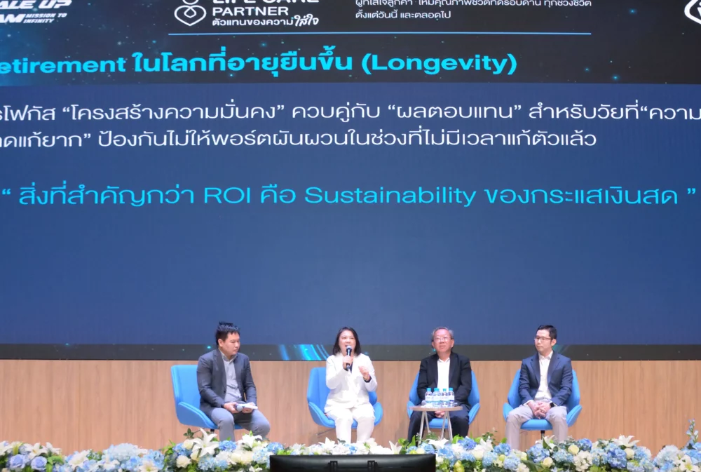 คุณนรินทร์ เอกวงศ์วิริยะ ผู้อำนวยการอาวุโส ฝ่ายการตลาดและสื่อสารองค์กร กรุงเทพประกันชีวิต กล่าวว่าPre -Retirement ในโลกที่อายุยืนขึ้น (Longevity) ควรเน้นการโฟกัส “โครงสร้างความมั่นคง” ควบคู่กับ “ผลตอบแทน” สำหรับวัยที่ “ความผิดพลาดแก้ยาก” การป้องกันไม่ให้พอร์ตผันผวนในช่วงที่ไม่มีเวลาแก้ตัวแล้ว สิ่งที่สำคัญกว่า ROI คือ Sustainability ของกระแสเงินสดแผนการเงินที่คนมีอายุยืนขึ้น จึงควรปรับเป้าหมายไม่ใช่เพียงให้ “พอใช้” เท่านั้นแต่ควรเพื่อ “คุณภาพชีวิตระยะยาว”