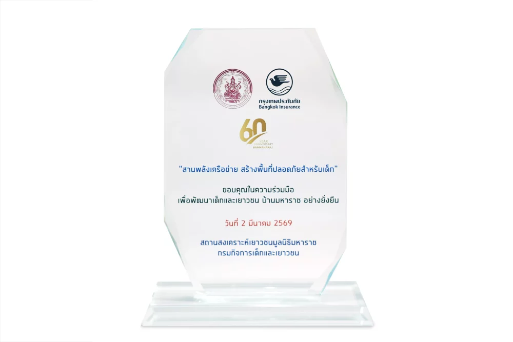บริษัท กรุงเทพประกันภัย จำกัด (มหาชน) รับโล่แสดงความขอบคุณในความร่วมมือเพื่อพัฒนาเด็กและเยาวชนบ้านมหาราชในงาน Open House ภายใต้โครงการ “สานพลังเครือข่าย สร้างพื้นที่ปลอดภัยสำหรับเด็ก” จัดโดยสถานสงเคราะห์เยาวชนมูลนิธิมหาราช กรมกิจการเด็กและเยาวชน จากการที่บริษัทฯ ให้ความสำคัญต่อการส่งเสริมและพัฒนาศักยภาพเด็กและเยาวชน เพื่อสร้างการเติบโตอย่างเข้มแข็งและมีคุณภาพ ด้วยการสนับสนุนโครงการต่างๆ ของสถานสงเคราะห์เยาวชนมูลนิธิมหาราช ได้แก่ โครงการปรับปรุงพื้นที่เพื่อบรรเทาและแก้ไขปัญหาน้ำท่วม การจัดกิจกรรมพัฒนาเด็กและเยาวชนเพื่อปลูกจิตสำนึกความรับผิดชอบต่อตนเอง สังคม และสิ่งแวดล้อม การจัดอบรมเชิงปฏิบัติการสำหรับผู้บริหารและบุคลากรสถานสงเคราะห์ฯ เพื่อเพิ่มพูนความรู้และทักษะในการปฏิบัติงาน เสริมสร้างทัศนคติที่ดี เพื่อนำไปสู่การพัฒนาคุณภาพชีวิตของเด็กและเยาวชน ณ สถานสงเคราะห์เยาวชนมูลนิธิมหาราช จังหวัดปทุมธานี เมื่อวันที่ 2 มีนาคม 2569