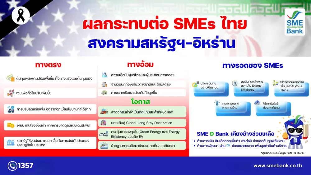 ศูนย์วิจัยและข้อมูล SME D Bank เผยสถานการณ์สหรัฐฯ-อิหร่าน  ส่งผลกระทบต่อเอสเอ็มอีไทยทั้งทางตรงและทางอ้อม  ดันต้นทุนธุรกิจเพิ่ม โดยเฉพาะค่าพลังงาน ชี้ภาคผลิตแนวโน้มได้รับผลกระทบมากที่สุด แถมฉุดความเชื่อมั่นและจำนวนนักท่องเที่ยวลดลง  แนะเร่งปรับตัว บริหารต้นทุนอย่างเป็นระบบ  ประกาศพร้อมช่วยเหลือเสมอ ผ่านบริการพาถึงสินเชื่อดอกเบี้ยต่ำ 3% ต่อปี ช่วยลดภาระการเงินและส่งเสริมใช้เทคโนโลยี ยกระดับสร้างทางใหม่ด้วยพลังงานสีเขียว  ควบคู่หนุนพัฒนาครบวงจร เพิ่มมูลค่าสินค้า บริการ และขยายหาตลาดใหม่