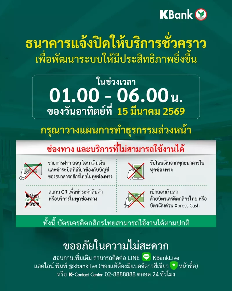 ธนาคารกสิกรไทย แจ้งปิดให้บริการชั่วคราว เพื่อพัฒนาระบบให้มีประสิทธิภาพยิ่งขึ้น ในวันอาทิตย์ที่ 15 มีนาคม 2569 เวลา 01:00 น. – 06:00 น. โดยช่องทางและบริการที่ไม่สามารถใช้งานได้ ดังนี้