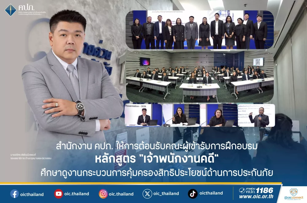 เมื่อวันที่ 11 มีนาคม 2569 สำนักงานคณะกรรมการกำกับและส่งเสริมการประกอบธุรกิจประกันภัย (สำนักงาน คปภ.) โดยนายอดิศร พิพัฒน์วรพงศ์ รองเลขาธิการ ด้านกฎหมายและตรวจสอบ ให้การต้อนรับนางสาวสุทจิ์ธิฎา สุทธิพงศ์คณาสัย รองเลขานุการศาลอุทธรณ์คดีชำนัญพิเศษ ช่วยทำงานชั่วคราวในตำแหน่งผู้พิพากษาศาลชั้นต้น ประจำสำนักประธานศาลฎีกา พร้อมด้วยคณะผู้ศึกษาดูงาน จำนวน 33 คน ในโอกาสเข้าเยี่ยมชมและศึกษาดูงาน พร้อมรับฟังการบรรยายในหลักสูตรเจ้าพนักงานคดี (ระดับปฏิบัติการ) ณ ห้องประชุมสถาบันวิทยาการประกันภัยระดับสูง ชั้น 2 สำนักงาน คปภ. ถนนรัชดาภิเษก กรุงเทพมหานคร