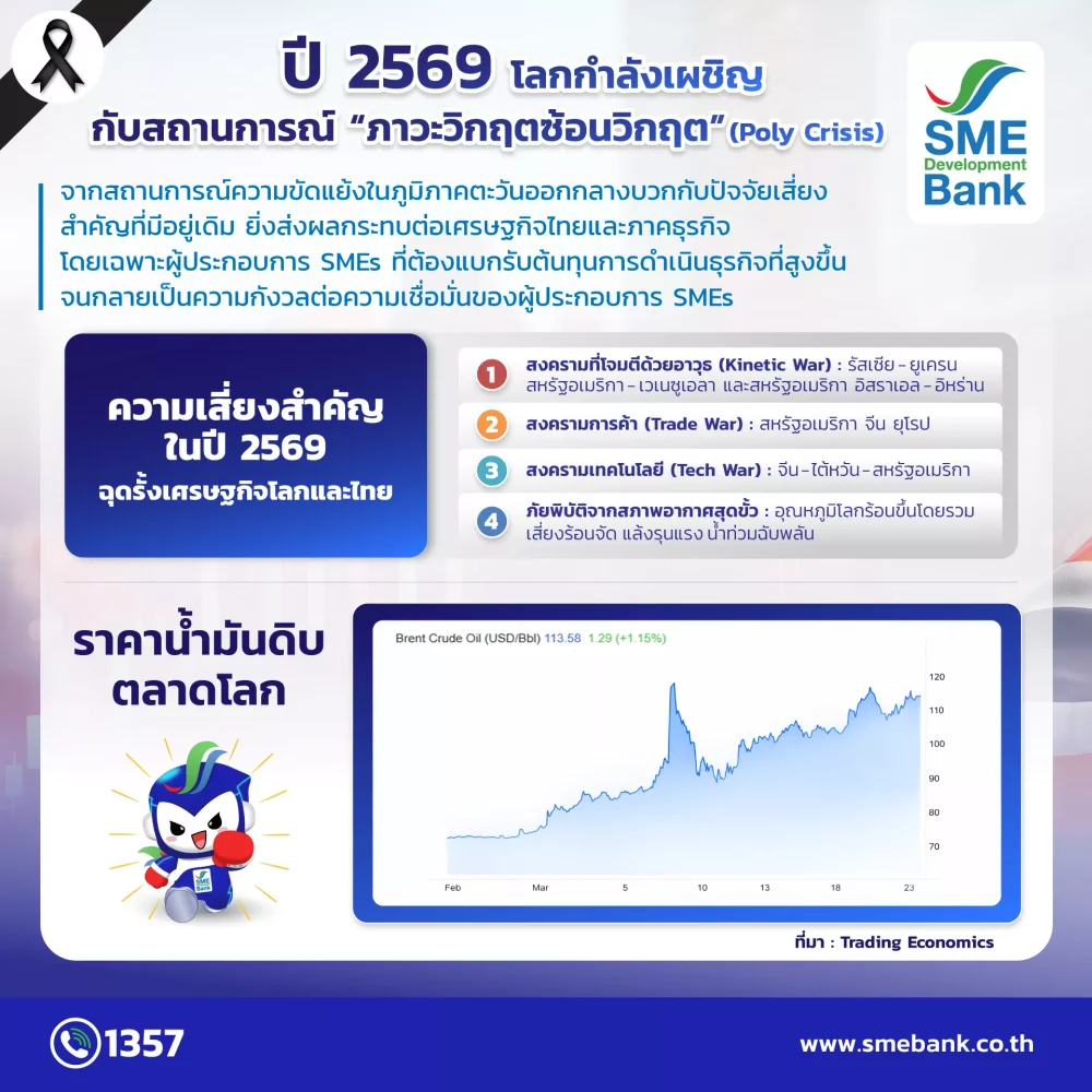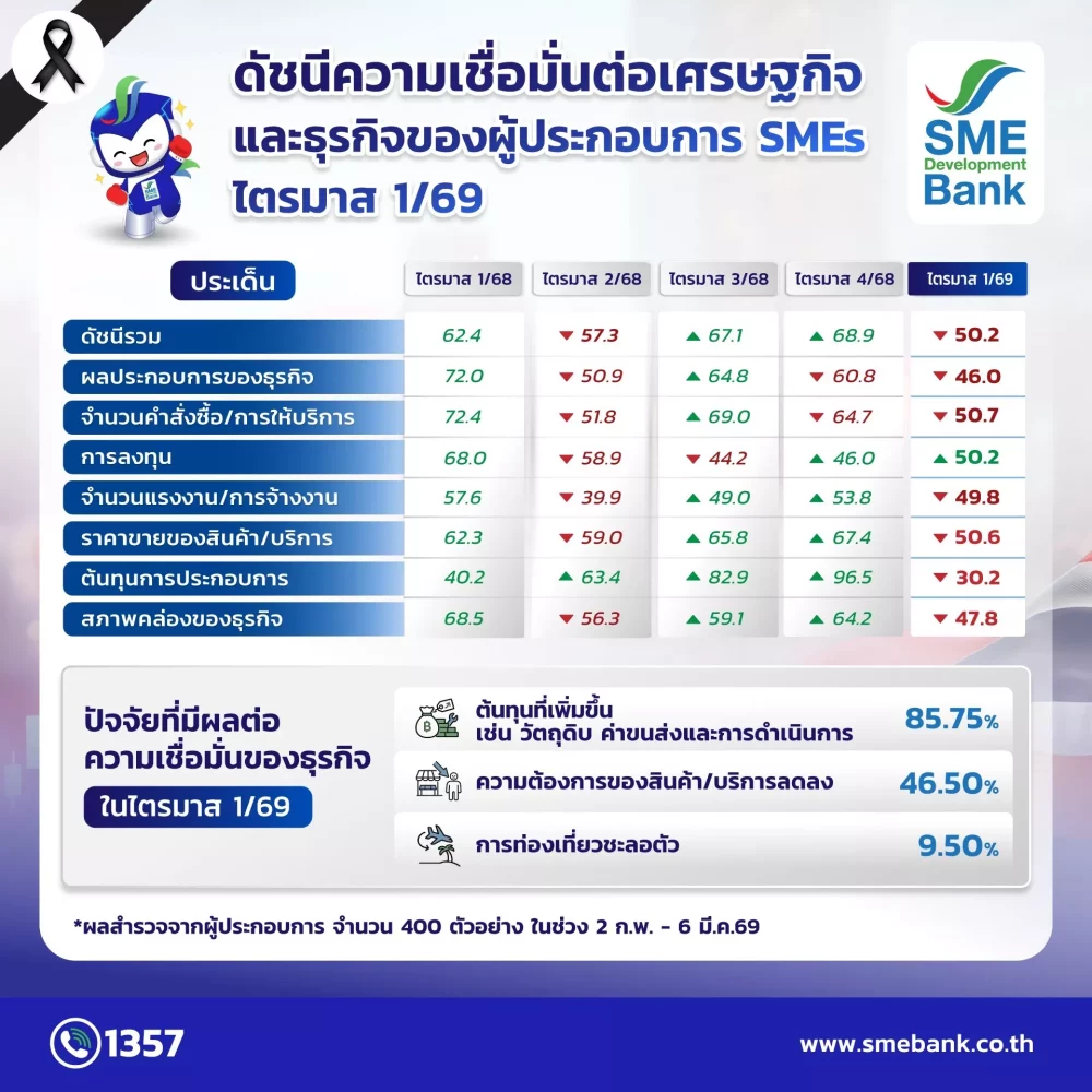 นายพิชิต มิทราวงศ์ กรรมการผู้จัดการ ธนาคารพัฒนาวิสาหกิจขนาดกลางและขนาดย่อมแห่งประเทศไทย (ธพว.) หรือ SME D Bank เปิดเผยว่า  SME D Bank โดย “ศูนย์วิจัยและข้อมูล ธพว.” ร่วมกับ สำนักวิจัยเศรษฐกิจและประเมินผล บริษัท เอ็กเซลเลนท์ บิสเนส แมเนจเม้นท์ จำกัด ทำการสำรวจ “ดัชนีความเชื่อมั่นของผู้ประกอบการเอสเอ็มอีต่อเศรษฐกิจและธุรกิจในไตรมาสที่ 1/2569 และคาดการณ์อนาคต” จากกลุ่มผู้ประกอบการเอสเอ็มอีทั่วประเทศ ครอบคลุมทุกประเภทอุตสาหกรรม จำนวน 400 ตัวอย่าง พบว่า ดัชนีความเชื่อมั่นรวมของผู้ประกอบการเอสเอ็มอี ประจำไตรมาส 1/69 อยู่ที่ระดับ 50.2 ลดลงจากไตรมาส 4/68 ที่อยู่ระดับ  68.9 เนื่องจากมีความกังวลต่อระดับราคาน้ำมันในประเทศที่จะปรับตัวสูงขึ้นจากผลกระทบของสงครามสหรัฐฯ กับอิหร่าน ส่งผลเชิงลบด้านต้นทุนการประกอบการ เช่น วัตถุดิบ ค่าขนส่งการดำเนินงาน รวมถึงผลกระทบต่อความเชื่อมั่นด้านคำสั่งซื้อ/บริการ ผลประกอบการที่ปรับลดลง และการท่องเที่ยวที่ชะลอตัว