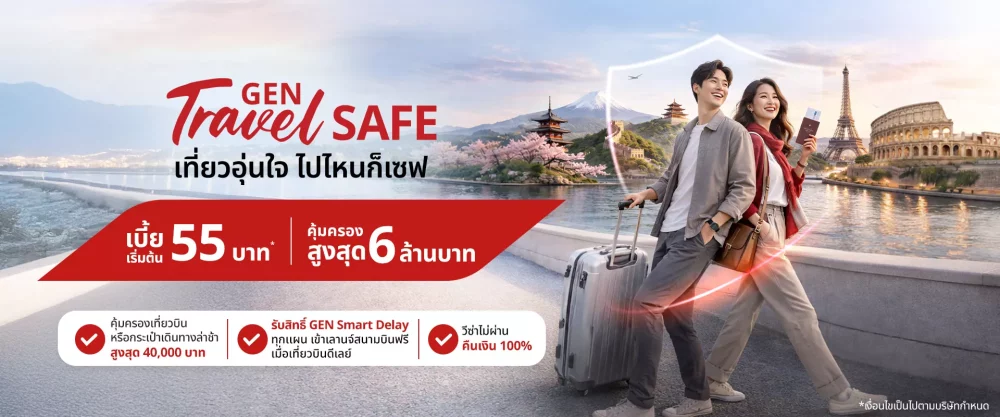 - GEN Travel Safe (เจน ทราเวล เซฟ) ประกันเดินทางออนไลน์ที่ให้ความคุ้มครองชีวิตและค่ารักษาพยาบาล ที่มีให้เลือกถึง 6 แผน ตามรูปแบบการท่องเที่ยวที่แตกต่างกัน คุ้มครองสูงสุด 6 ล้านบาท ค่าเบี้ยเริ่มต้นเพียง 55 บาท ต่อทริป หรือ เริ่มต้นเพียง 1,029 บาท แบบรายปี เพิ่มความสะดวกขึ้น สำหรับสายเดินทางตัวจริง พร้อมอัพสิทธิประโยชน์ Smart Delay ใช้บริการห้องรับรองในสนามบินเมื่อเที่ยวบินล่าช้าให้กับลูกค้าในทุกแผน รวมถึงความคุ้มครองกระเป๋าเดินทางเสียหาย และการคืนเงิน 100% หากวีซ่าไม่ผ่าน