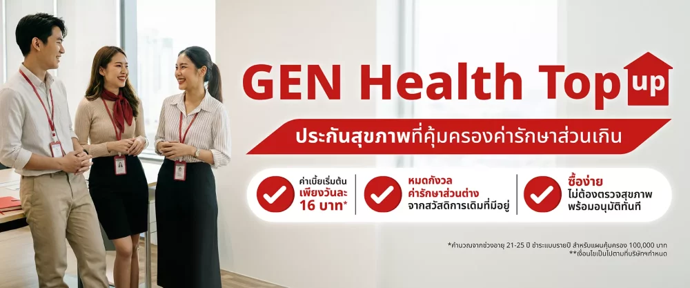 - GEN Health Top up (เจน เฮลท์ ท็อปอัป) ประกันสุขภาพที่ช่วยเสริมวงเงินค่ารักษาพยาบาลส่วนเกินจากสวัสดิการเดิมหรือจากประกันสุขภาพกลุ่มของพนักงานที่มีอยู่ โดยให้ความคุ้มครองเหมาจ่ายสูงสุด 300,000 บาท ค่าเบี้ยเริ่มต้นเพียงวันละ 16 บาท