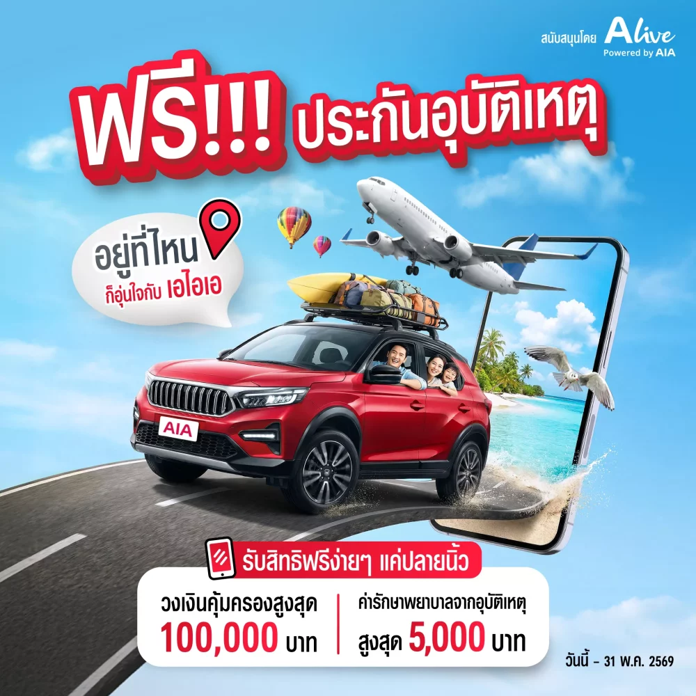 เอไอเอ ประเทศไทย จับมือกับ เอ ไลฟ์ (ALive Powered by AIA) โดยบริษัท เอไอเอ เวลเนส จำกัด ส่งความห่วงใยถึงคนไทยทั่วประเทศในช่วงเทศกาลสงกรานต์ 2569 เปิดตัวแคมเปญ “กรมธรรม์ประกันภัยสงกรานต์เบิกบานใจ (ไมโครอินชัวรันส์)” มอบกรมธรรม์ประกันภัยกลุ่มให้แก่ประชาชนทั่วไปโดยไม่มีค่าใช้จ่าย ระยะเวลาคุ้มครองนาน 30 วัน ด้วยวงเงินคุ้มครองชีวิตสูงถึง 100,000 บาทต่อกรมธรรม์ กรณีเสียชีวิตจากอุบัติเหตุ พร้อมรับผลประโยชน์ค่ารักษาพยาบาลเนื่องจากอุบัติเหตุตามจำนวนที่จ่ายจริงสูงสุด 5,000 บาท* เพื่อส่งเสริมให้คนไทยมีหลักประกันความคุ้มครองอุบัติเหตุในช่วงเทศกาลสงกรานต์ ซึ่งเป็นช่วงที่คนส่วนใหญ่เดินทางกลับภูมิลำเนาหรือเดินทางท่องเที่ยว อีกทั้งยังเป็นการขานรับนโยบายของสำนักงานคณะกรรมการกำกับและส่งเสริมการประกอบธุรกิจประกันภัย (คปภ.) พร้อมกับการเดินหน้าตามพันธกิจของเอไอเอที่ต้องการสนับสนุนให้คนไทยเข้าถึงการประกันภัยเพื่อความอุ่นใจและลดภาระของครอบครัว ให้คนไทยทั่วประเทศมีสุขภาพและชีวิตที่ดีขึ้น ตามคำมั่นสัญญา ‘Healthier, Longer, Better Lives’