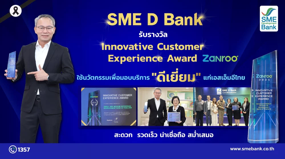 ธนาคารพัฒนาวิสาหกิจขนาดกลางและขนาดย่อมแห่งประเทศไทย (ธพว.) หรือSME D Bank รับมอบรางวัล “Innovative Customer Experience Award” จาก “Zanroo” บริษัทชั้นนำผู้ให้บริการเทคโนโลยี Social Listening และ Data Analytics โดยจะมอบรางวัลดังกล่าวให้แก่องค์กรหรือแบรนด์ที่นำเทคโนโลยีดิจิทัลมาบริการดูแลลูกค้าได้อย่างดีเยี่ยม ทั้งความรวดเร็ว น่าเชื่อถือ สม่ำเสมอ ลดขั้นตอน ตลอดจนสร้างประสบการณ์ที่ดี และความพึงพอใจจากบริการที่ราบรื่น ซึ่งบริการของ SME D Bank มีความโดดเด่น ยึด “ลูกค้าเป็นศูนย์กลาง” นำนวัตกรรมมายกระดับขับเคลื่อนการให้บริการลูกค้าและผู้ประกอบการเอสเอ็มอีได้อย่างดีเยี่ยม เหมาะสมกับยุคดิจิทัล ด้วยการใช้เทคโนโลยี เช่น Social Monitoring และ Chatbot มาอำนวยความสะดวก ตอบสนองความต้องการของลูกค้าในทุกช่องทางติดต่อ ช่วยให้ลูกค้า โดยเฉพาะกลุ่มผู้ประกอบการเอสเอ็มอีเข้าถึงบริการต่าง ๆ ทั้งด้านการเงิน หรือด้านการพัฒนา ได้สะดวกสบาย รวมถึง สามารถตอบข้อสงสัยและคำถามต่างๆ ได้ครบถ้วน ตลอด 24 ชม.