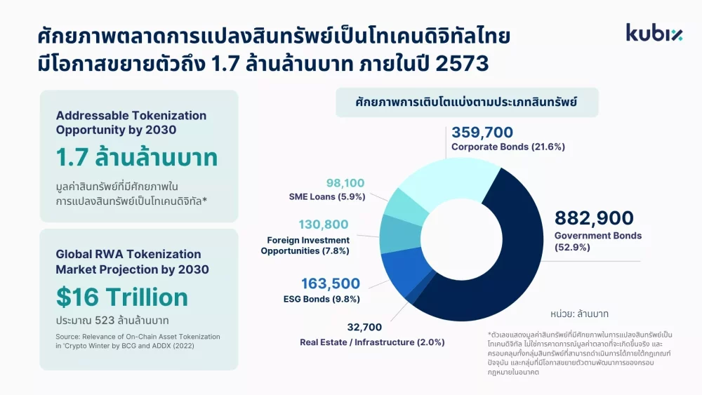 บริษัท คิวบิกซ์ ดิจิทัล แอสเสท จำกัด (kubix) ผู้ให้บริการระบบเสนอขายโทเคนดิจิทัล (ICO Portal) ชั้นนำของไทย ร่วมกับโอนิกิริ แคปิทัล (Onigiri Capital) กองทุนร่วมลงทุนในเครือเซย์ซอน แคปิทัล (Saison Capital) หน่วยงานด้านการลงทุนของกลุ่มบริษัทเครดิต เซย์ซอน ประเทศญี่ปุ่น เผยแพร่รายงานวิจัยเชิงลึก “Project Thara: Institutionalizing Real-World Asset Tokenization-Where Thailand’s Real Economy Meets Digital Capital” การยกระดับการแปลงสินทรัพย์ในโลกจริงเป็นโทเคนดิจิทัลในระดับสถาบัน เพื่อวิเคราะห์ศักยภาพและทิศทางการเติบโตของตลาดการแปลงสินทรัพย์เป็นโทเคนดิจิทัลในประเทศไทย คาดมีมูลค่าโอกาสทางเศรษฐกิจสูงถึง 51,000 ล้านดอลลาร์สหรัฐ หรือราว 1.7 ล้านล้านบาท ภายในปี 2573