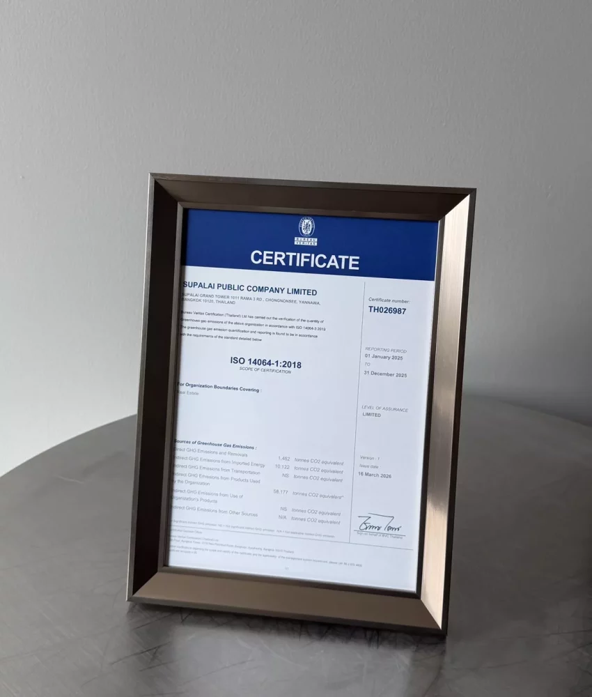 บริษัท ศุภาลัย จำกัด (มหาชน) โดย นายกิตติพงษ์ ศิริลักษณ์ตระกูล รองกรรมการผู้จัดการ (กลาง) รับมอบประกาศนียบัตรรับรองระบบมาตรฐานสากล ISO 14064-1:2018 การรายงานผลการปล่อยปริมาณก๊าซเรือนกระจกของระดับองค์กร จาก นายศราวุธ ศุภรัตนชาติพันธ์ ผู้อำนวยการฝ่ายธุรกิจการรับรองระบบมาตรฐาน
