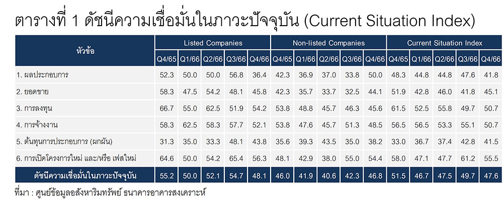 เมื่อจำแนกความเชื่อมั่นตามกลุ่มผู้ประกอบการฯ พบว่า ความเชื่อมั่นในภาวะปัจจุบันของผู้ประกอบการกลุ่ม Listed Companies ในไตรมาส 4 ปี 2566 มีค่าดัชนีเท่ากับ 48.1 น้อยกว่าไตรมาสก่อนหน้าที่มีค่าดัชนีระดับ 54.7 และต่ำกว่าค่ากลางที่ระดับ 50.0 แสดงให้เห็นว่าผู้ประกอบการกลุ่ม Listed Companies มีความกังวลต่อธุรกิจในภาวะปัจจุบัน โดยเฉพาะในด้านผลประกอบการที่ลดลงไปที่ระดับ 36.4 จากไตรมาสก่อนที่ระดับ 56.8 และด้านการเปิดโครงการใหม่ และ/หรือเฟสใหม่ลดลงไปที่ 56.3 จากไตรมาสก่อนที่ระดับ 65.4 ขณะที่ผู้ประกอบการกลุ่ม Non-listed Companies ในไตรมาส 4 ปี 2566 มีค่าดัชนีความเชื่อมั่นที่ระดับ 46.8 เพิ่มขึ้นจากไตรมาสก่อนหน้าซึ่งอยู่ที่ระดับ 42.3 ซึ่งยังคงต่ำกว่าค่ากลางที่ระดับ 50.0 แสดงให้เห็นว่าผู้ประกอบการรายย่อยกลุ่ม Non-listed Companies ยังคงมีความกังวลต่อปัจจัยลบต่าง ๆ เช่นเดียวกับกลุ่ม Listed Companies ทั้งนี้ ความเชื่อมั่นของผู้ประกอบการ Non-listed Companies ที่เพิ่มขึ้นอย่างชัดเจนคือด้านผลประกอบการที่เพิ่มขึ้นเป็นระดับ 50.0